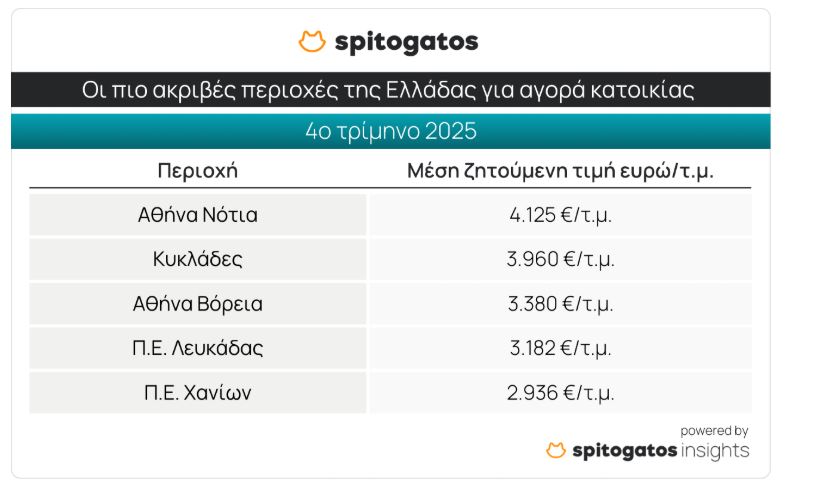Την πεντάδα στη λίστα με τα 5 πιο ακριβά σημεία της χώρας για αγορά κατοικίας συμπληρώνουν η Περιφερειακή Ενότητα (Π.Ε.) Λευκάδας και η Π.Ε. Χανίων, με ΜΖΤ στα 2.936 ευρώ/τ.μ.