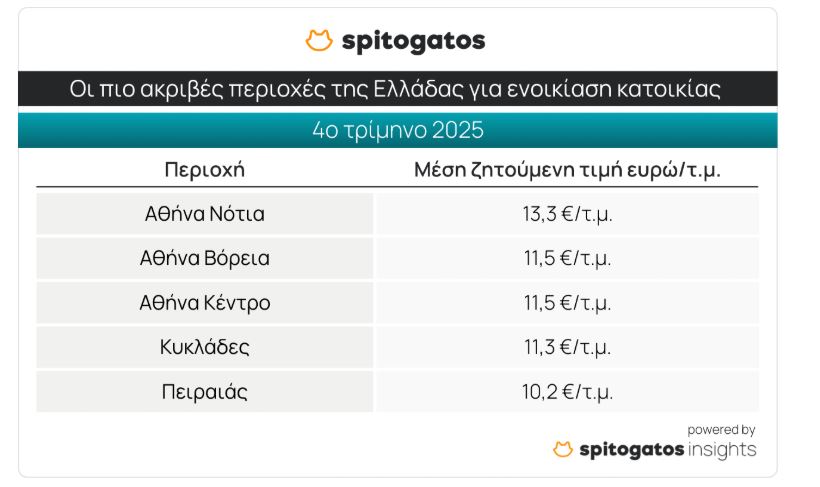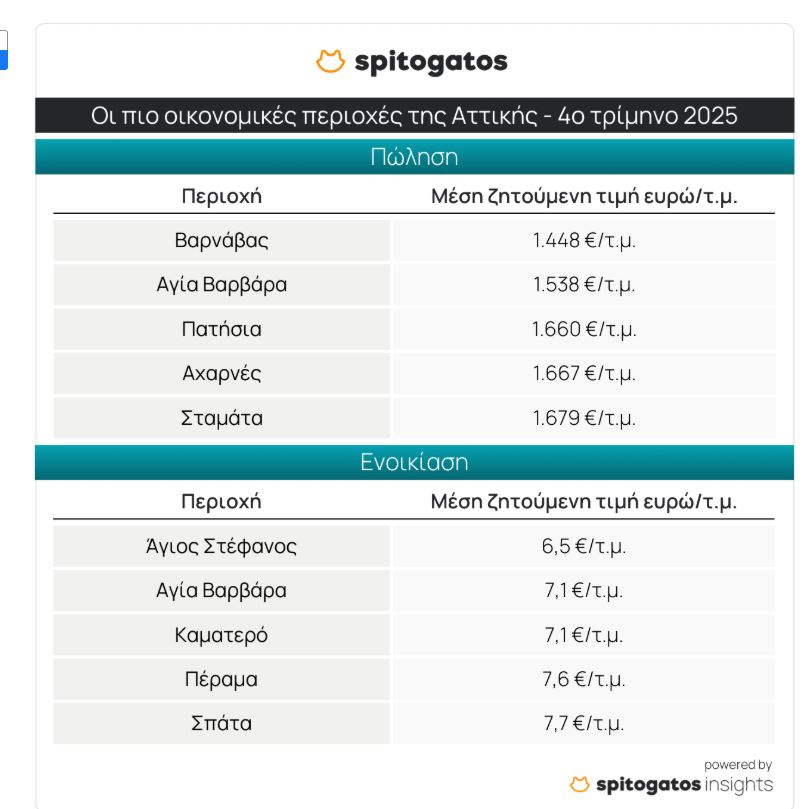 Οι πιο οικονομικές περιοχές για ενοικίαση κατοικίας στην Αττική κατά το 4ο τρίμηνο του 2025 είναι ο Άγιος Στέφανος στα Βόρεια Προάστια της Αθήνας, με ΜΖΤ στα 6,5 ευρώ/τ.μ., η Αγία Βαρβάρα και το Καματερό στα Δυτικά Προάστια, το Πέραμα στα Προάστια του Πειραιά και τα Σπάτα στην Ανατολική Αττική.