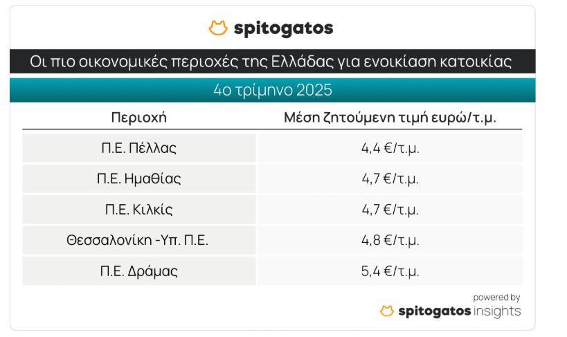 Τα οικονομικότερα σημεία της Ελλάδας για ενοικίαση κατοικίας κατά το 4ο τρίμηνο του 2025 είναι οι Π.Ε. Πέλλας, Ημαθίας, Κιλκίς, το Υπόλοιπο της Περιφερειακής Ενότητας Θεσσαλονίκης και η Π.Ε. Δράμας.
