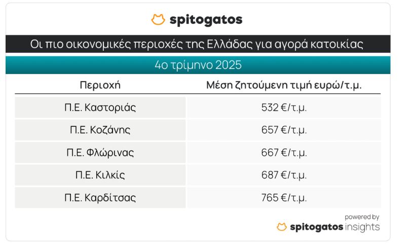 Ωστόσο, τα πιο οικονομικά σημεία της χώρας για αγορά κατοικίας είναι η Π.Ε. Καστοριάς με ΜΖΤ πώλησης κατοικίας στα 532 ευρώ/τ.μ., ενώ ακολουθούν οι Π.Ε. Κοζάνης, Φλώρινας, Κιλκίς και Καρδίτσας.