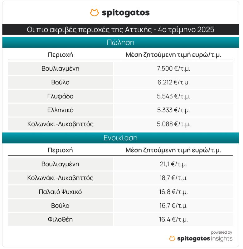 Σε ό,τι αφορά την ενοικίαση κατοικίας, και για το 4ο τρίμηνο του 2025, η Βουλιαγμένη αναδεικνύεται ως η ακριβότερη περιοχή της Αττικής, με ΜΖΤ ενοικίασης στα 21,1 ευρώ/τ.μ., τιμή αυξημένη κατά 5,7% σε σύγκριση με το 4ο τρίμηνο του 2024. Ακολουθούν οι περιοχές Κολωνάκι-Λυκαβηττός, Παλαιό Ψυχικό, Βούλα και Φιλοθέη, με ΜΖΤ που διαμορφώνεται στα 16,4 ευρώ/τ.μ. Στη Φιλοθέη καταγράφεται μείωση -8,0% σε ετήσια βάση, ενώ οι υπόλοιπες περιοχές της πρώτης πεντάδας σημειώνουν ετήσιες αυξήσεις που κυμαίνονται μεταξύ 2,9% και 12,0%.