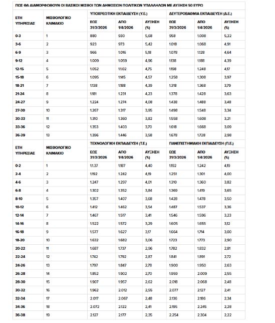 * Ο εισαγωγικός βασικός μισθός στο Δημόσιο, που λαμβάνεται από νεοπροσληφθέντα υπάλληλο της κατηγορίας της Υποχρεωτικής Εκπαίδευσης (Υ.Ε.) και ο οποίος σήμερα ανέρχεται στα 880 ευρώ, θα πρέπει κι αυτός από την 1η-4-2026 να ανέλθει στα 930 ευρώ, ώστε να είναι ίσος με τον κατώτατο μισθό του ιδιωτικού τομέα. Αυτό σημαίνει ότι από την 1η-4-2026, ο εισαγωγικός βασικός μισθός στο Δημόσιο θα αυξηθεί κατά 50 ευρώ, προκειμένου να μην υπολείπεται του νέου κατώτατου μισθού του ιδιωτικού τομέα.