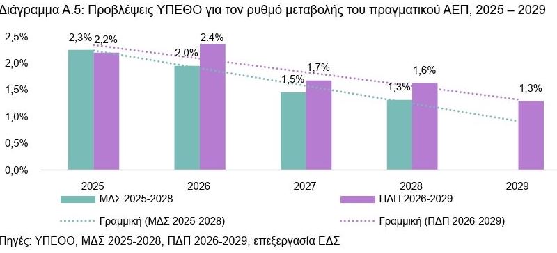 Για τo διάστημα 2027–2029 οι μακροοικονομικές προβλέψεις του ΠΔΠ 2026-2029 διαμορφώνονται σε πιο συντηρητικό εύρος και αυτό δείχνει πως επιβραδύνεται σταδιακά ο ρυθμός οικονομικής μεγέθυνσης.