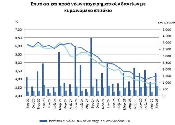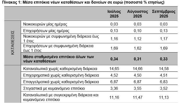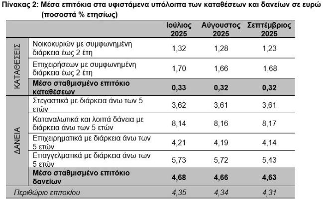 Σύμφωνα με τα στοιχεία της ΤτΕ, τον Σεπτέμβριο του 2025, το μέσο σταθμισμένο επιτόκιο του συνόλου των υφιστάμενων καταθέσεων παρέμεινε αμετάβλητο στο 0,32%, ενώ το αντίστοιχο επιτόκιο των υφιστάμενων δανείων παρέμεινε σχεδόν αμετάβλητο στο 4,63%.