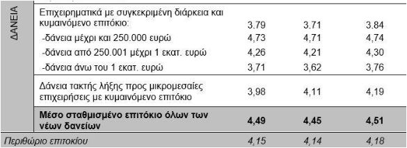 Το μέσο επιτόκιο στα υφιστάμενα υπόλοιπα των επιχειρηματικών δανείων με διάρκεια άνω των 5 ετών μειώθηκε κατά 5 μονάδες βάσης και διαμορφώθηκε στο 4,14%, ενώ το αντίστοιχο επιτόκιο των επαγγελματικών δανείων μειώθηκε κατά 29 μονάδες βάσης και διαμορφώθηκε στο 5,43%
