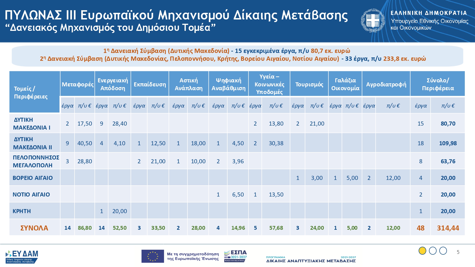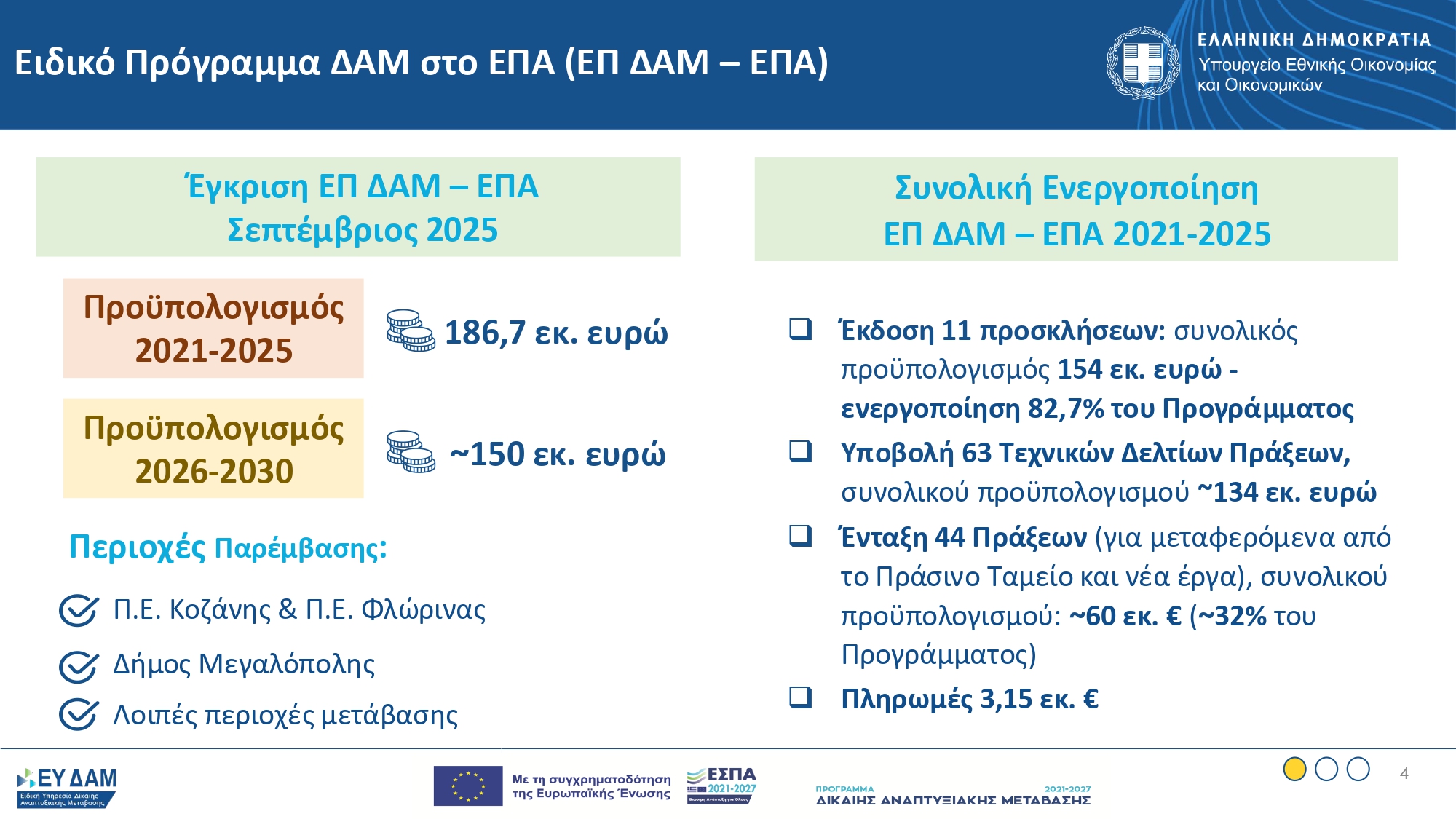 Ταυτόχρονα, ενισχύονται οι περιοχές της δίκαιης μετάβασης, μέσα από προγράμματα όπως του Προγράμματος ΔΑΜ στο πλαίσιο του ΕΣΠΑ 2021-2027 ύψους 1,6 δις ευρώ και με υπερδέσμευση στα 1,9 δις ευρώ, του Ειδικού Προγράμματος ΔΑΜ στο πλαίσιο του ΕΠΑ, ύψους 186,7 εκ. ευρώ και του δανειακού μηχανισμού στο πλαίσιο του Πυλώνα ΙΙΙ του ευρωπαϊκού Μηχανισμού ΔΑΜ μέσω 2 συμβάσεων συνολικού προϋπολογισμού 313 εκατ. ευρώ. Οι πόροι που έχουν διασφαλιστεί για την υλοποίηση έργων και επενδύσεων σε όλες τις περιοχές ΔΑΜ ξεπερνούν τα 2,1 δις ευρώ. Ενδεικτικές δράσεις αποτελούν ο Κόμβος Υδρογόνου του ΕΚΕΤΑ στην Πτολεμαΐδα, τα «έξυπνα εργαστήρια» του Κόμβου Βιοοικονομίας στην ευρύτερη περιοχή της Μεγαλόπολης, η επένδυση υδροπονίας της Wonderplant στη Δυτ. Μακεδονία, το πιλοτικό πρόγραμμα για τη μετατροπή της Μεγαλόπολης και του Αμύνταιου σε green / smart cities.