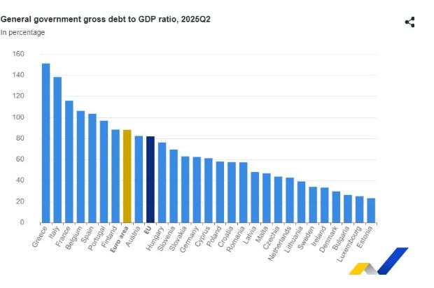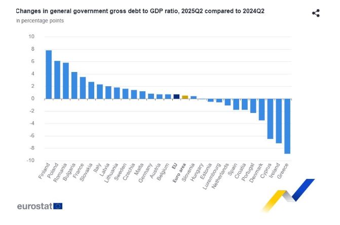Τη μεγαλύτερη μείωση δημοσίου χρέους κατέγραψε η Ελλάδα μεταξύ των χωρών της ΕΕ στο τέλος του β’ τριμήνου του 2025, ωστόσο παραμένει το υψηλότερο στην Ευρωζώνη, , όπως αυτό προέκυψε από τα στοιχεία της Eurostat.