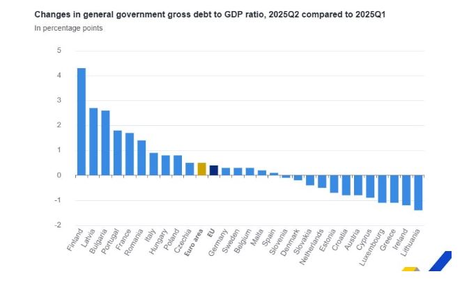 Οι μεγαλύτερες αυξήσεις του δείκτη χρέους καταγράφηκαν στις εξής χώρες: στη Φινλανδία (+4,3 π.μ.), τη Λετονία (+2,7 π.μ.), στη Βουλγαρία (+2,6 π.μ.), ατην Πορτογαλία (+1,8 π.μ.), ατη Γαλλία (+1,7 π.μ.) και στη Ρουμανία (+1,4 π.μ.).