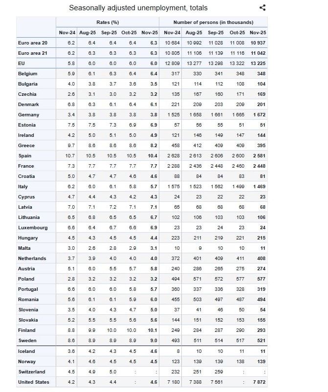 Αξίζει να σημειωθεί πως το υψηλότερο ποσοστό ανεργίας στην ΕΕ εμφάνισε η Ισπανία με 10,4%. Πιο υψηλό ποσοστό ανεργίας από την Ελλάδα είχαν οι εξής χώρες: η Φινλανδία με 10,1% και η Σουηδία με 9%. Τα χαμηλότερα ποσοστά καταγράφηκαν στη Μάλτα με 3,2% και στη Τσεχία με3,2%.