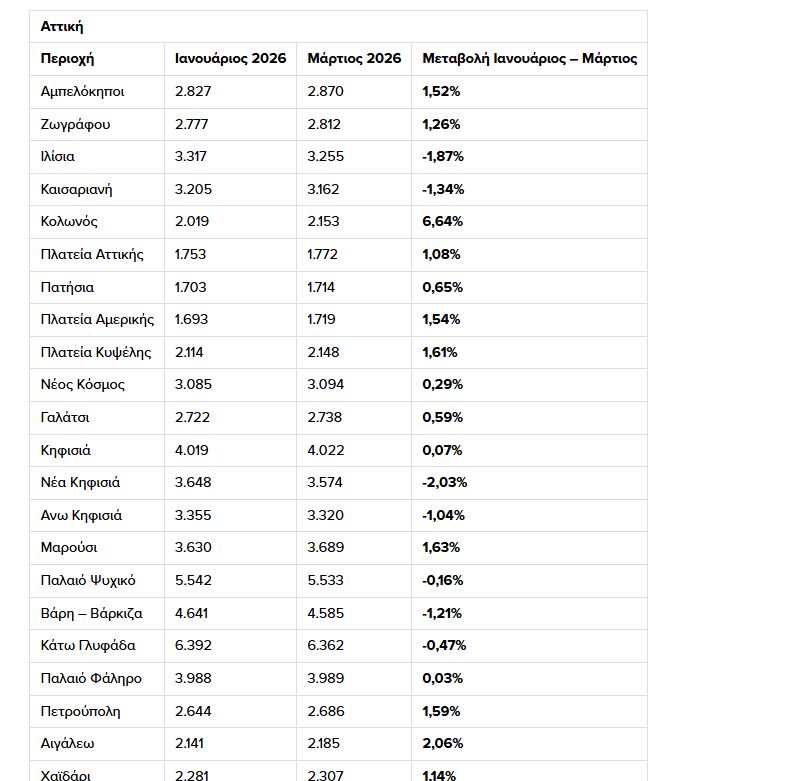 Όπως αναφέρει η εφημερίδα Ελεύθερος Τύπος, στην πραγματικότητα της ελληνικής αγοράς, που χρόνο με τον χρόνο κερδίζει 8-11%, (2023: +10,9%, 2024: +8,8%, 2025: +9,4%) αυτό σημαίνει μειωμένη άνοδο και σε ορισμένες, όχι πολλές, περιπτώσεις και μείωση ζητούμενων τιμών. Σε έρευνα 60 περιοχών της Ελλάδας, με περισσότερες περιοχές από τα μεγαλύτερα πληθυσμιακά κέντρα της Αττικής και της Θεσσαλονίκης, οι 21 περιοχές «γύρισαν» σε πτώση μέσης ζητούμενης τιμής (ευρώ/τ.μ.) και ακόμη 5 έκοψαν ταχύτητα και έπεσαν σε οριακή άνοδο κοντά ή κάτω από το 0,1%. Η σύγκριση έγινε από το τέλος Ιανουαρίου, πριν ξεκινήσουν οι πολεμικές προετοιμασίες στη Μέση Ανατολή, έως και το τέλος Μαρτίου, που είναι τα πιο πρόσφατα στοιχεία της αγοράς. Περιλαμβάνουν την αβεβαιότητα του Φεβρουαρίου και τις πολεμικές επιχειρήσεις του Μαρτίου, που έφεραν πληθωριστικές πιέσεις στην οικονομία και αναστάτωση στην αγορά.