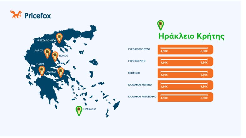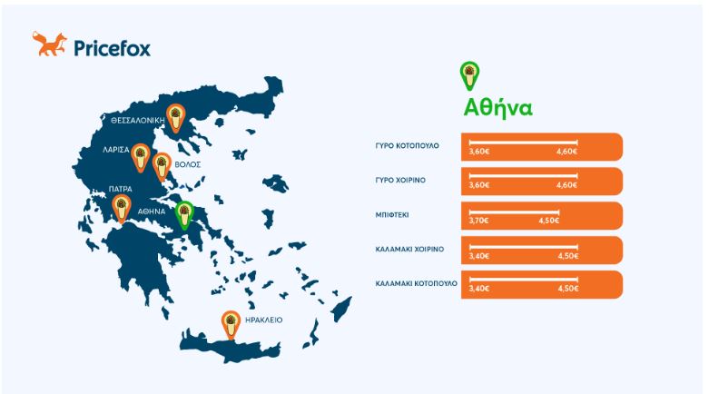 Οι μέσες τιμές για γύρο, μπιφτέκι και καλαμάκια κυμαίνονται περίπου από 3,96 ευρώ έως 4,19 ευρώ, με ελάχιστες τιμές γύρω στα 3,30 ευρώ–3,40 ευρώ.