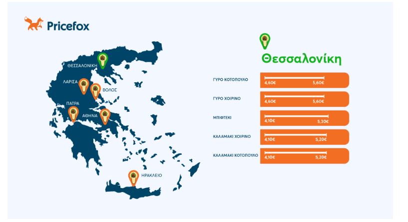 Στη Θεσσαλονίκη η εικόνα είναι διαφορετική. Οι μέσες τιμές για γύρο, μπιφτέκι και καλαμάκια κινούνται κοντά στα 4,70 ευρώ–5,10 ευρώ, με εύρος που ξεκινά από περίπου 4,10 ευρώ και φτάνει έως και 5,60 ευρώ.