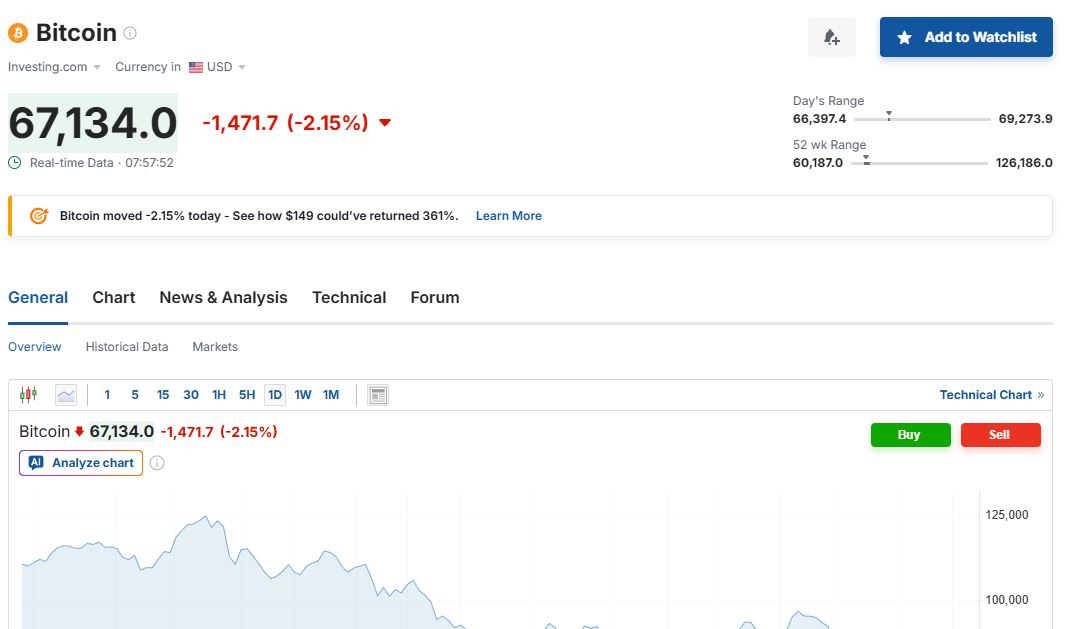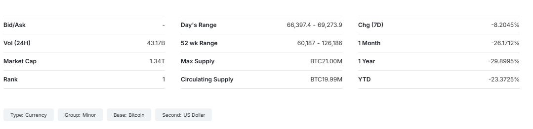 Νωρίτερα η τιμή του γνωστού κρυπτονομίσματος κινούνταν περίπου στα 66.737 δολάρια, όπως μετέδωσε το CNBC. Επίσης το ίδιο δημοσίευμα αναφέρει πως η τιμή του bitcoin βρίσκεται σε μια πτωτική πορεία, ύστερα από το ιστορικό υψηλό άνω των 126.000 δολαρίων που κατέγραψε τον Οκτώβριο.