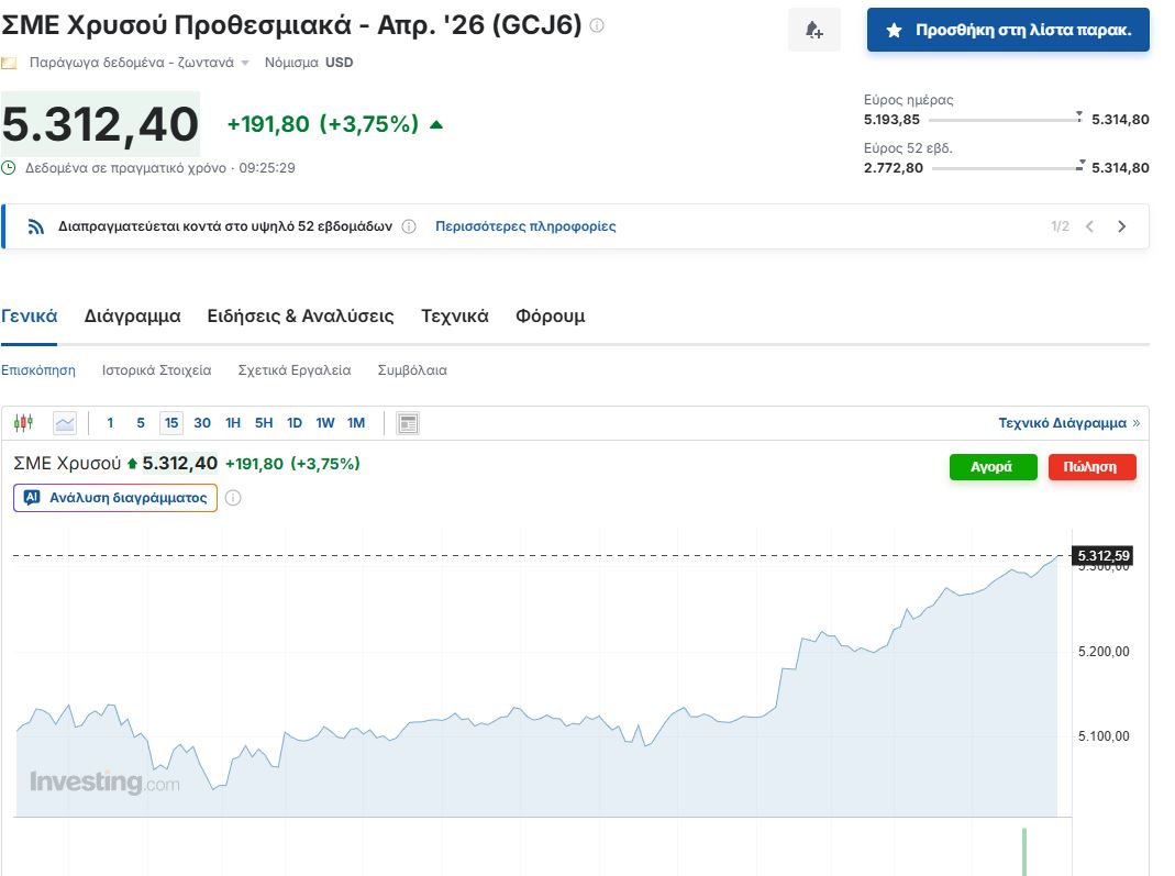 Μάλιστα σύμφωνα με το investing.com, σήμερα στις 9.25 π.μ ώρα Ελλάδας η τιμή του χρυσού κατέγραψε μια αύξηση της τάξεως του 3,75% και ανήλθε στα 5.312,40 δολάρια ανά ουγγιά από 5.218,8 δολάρια ανά ουγγιά που ήταν στο άνοιγμα. Αξίζει να σημειωθεί πως το εύρος της τιμής του κίτρινου μετάλλου είναι από 5.193,85 δολάρια ανά ουγγιά μέχρι και τα 5.314,80 δολάρια ανά ουγγιά ενώ στο προηγούμενο κλείσιμο η τιμή του ήταν στο 5.120,6 δολάρια ανά ουγγιά.