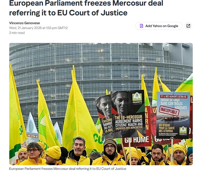 Την παραπομπή της συμφωνίας ΕΕ – Mercosur για το εμπόριο στο Δικαστήριο της ΕΕ ψήφισε σήμερα το Ευρωπαϊκό Κοινοβούλιο, όπως μεταδίδει το sg.news.yahoo.com
