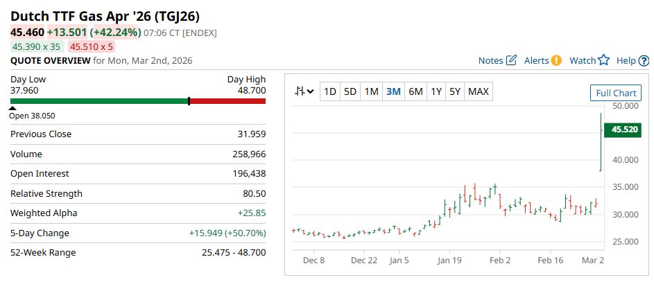Ειδικότερα, σύμφωνα με το barchart.com, σήμερα στις 3.16 μμ το μεσημέρι ώρα Ελλάδας η τιμή του φυσικού αερίου αυξήθηκε κατά 42,24% και ανήλθε στα 45,460 ευρώ ανά μεγαβατώρα από 38,500 ευρώανά μεγαβατώρα που ήταν στο άνοιγμα και 31,959 ευρώ ανά μεγαβατώρα που ήταν στο προηγούμενο κλείσιμο.