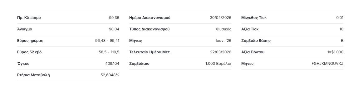 Ειδικότερα, σύμφωνα με το investing.com, σήμερα στις 2.06 το μεσημέρι ώρα Ελλάδας η τιμή του brent κατέγραψε μια πτώση της τάξεως του 0,36% και ανήλθε στα 99 δολάρια το βαρέλι από 98,04 δολάρια το βαρέλι που ήταν στο άνοιγμα, ενώ στο προηγούμενο κλείσιμο η τιμή του ήταν στο 99, 36 δολάρια το βαρέλι. Ακόμη τα ίδια στοιχεία δείχνουν πως το εύρος της τιμής του για την σημερινή ημέρα είναι από 96,48 δολάρια το βαρέλι με 99, 41 δολάρια το βαρέλι.