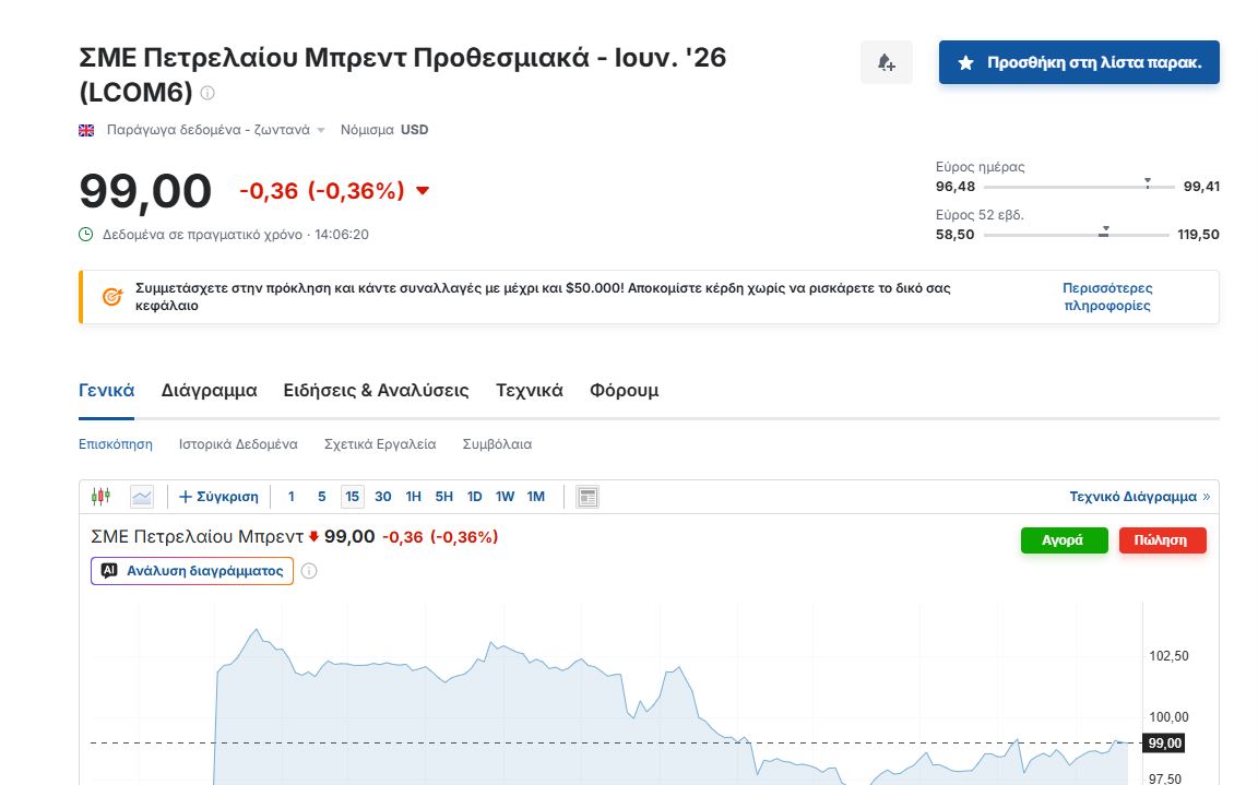 Kάτω από τα επίπεδα των 100 δολαρίων το βαρέλι έπεσε σήμερα η τιμή του αργού πετρελαίου (brent) καθώς η αγορά φαίνεται να πιστεύει πως ένα μέρος της αποκλιμάκωσης της σύγκρουσης στη Μέση Ανατολή οφείλεται στις νέες δηλώσεις που έκανε ο πρόεδρος των ΗΠΑ, Ντόναλντ Τραμπ ότι η πλευρά του Ιράν επικοινώνησε μαζί του τηλεφωνικώς.