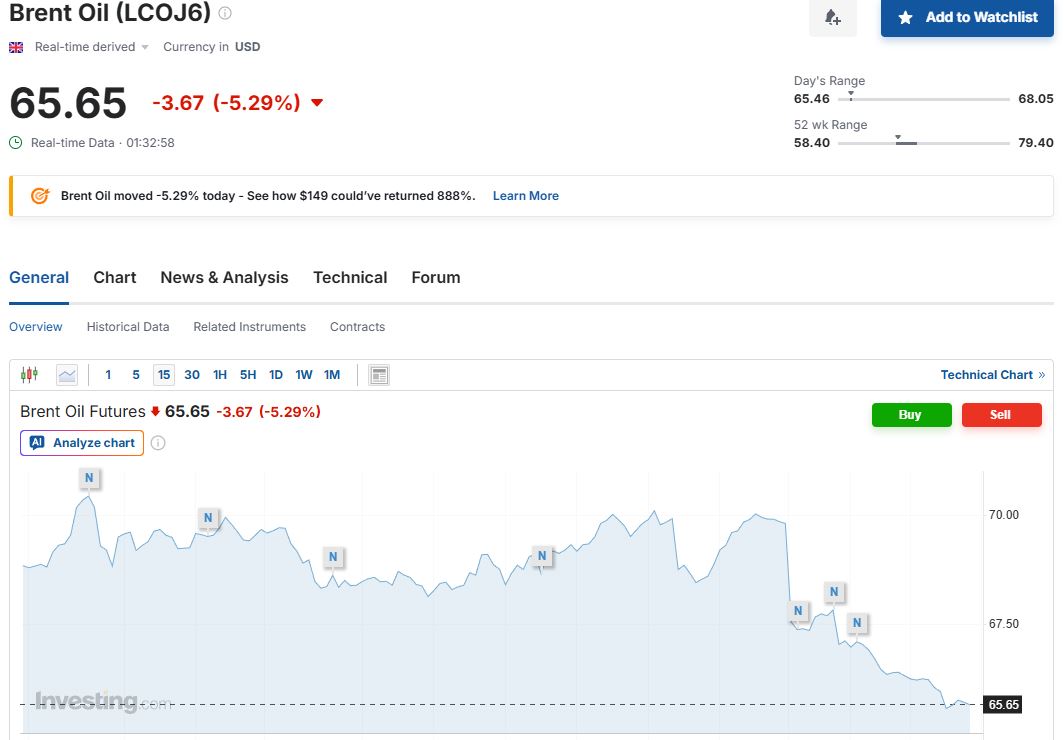Νωρίτερα το www.cnbc.com επικαλούμενο στοιχεία του LSEG ανέφερε πως ο παγκόσμιος δείκτης αναφοράς για το πετρέλαιο Brent υποχώρησε έως και 6,4% και ανήλθε στα 66,15 δολάρια το βαρέλι ενώ τα προηγούμενα στοιχεία έδειχναν πως σημειώνονταν μια πτώση 4,41%. Σύμφωνα μάλιστα με το ίδιο δημοσίευμα, το αργό πετρέλαιο της Βενεζουέλας που προέρχεται κατά κόρον από υπεράκτια και χερσαία αποθέματα και όχι από νέα παραγωγή, προστίθεται στα διαθέσιμα βαρέλια, τη στιγμή που η παγκόσμια παραγωγή πετρελαίου εξακολουθεί να υπερβαίνει τα όρια της ζήτησης.