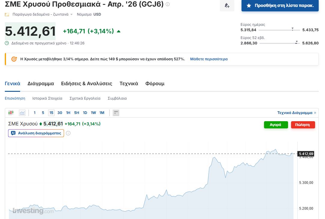 Ειδικότερα, σύμφωνα με το investing.com, σήμερα στις 12.46 το μεσημέρι ώρα Ελλάδας η τιμή του χρυσού κατέγραψε μια αύξηση της τάξεως του 3,14% και διαμορφώθηκε στις 5.421 δολάρια ανά ουγγιά από 5.364, 5 δολάρια που ήταν στο άνοιγμα και 5,247,9 ουγγιά που ανέρχονταν στο προηγούμενο κλείσιμο. Αξίζει να σημειωθεί πως το εύρος της τιμής του πολύτιμου μετάλλου ήταν από 5.315,84 ουγγιά  έως και 5.433,75 ουγγιά.