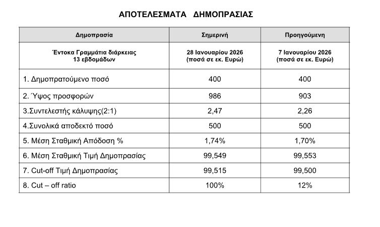 Η απόδοση διαμορφώθηκε στο 1,74%. Υποβλήθηκαν συνολικές προσφορές ύψους 986 εκατομμυρίων ευρώ, που υπερκάλυψαν το ζητούμενο ποσό κατά 2,47 φορές. Η δημοπρασία πραγματοποιήθηκε μέσω των Βασικών Διαπραγματευτών Αγοράς (Primary Dealers), και η ημερομηνία διακανονισμού είναι η Παρασκευή 30 Ιανουαρίου 2026. Έγιναν δεκτές προσφορές μέχρι του ύψους του δημοπρατηθέντος ποσού, καθώς και μη ανταγωνιστικές προσφορές ύψους 100 εκατομμυρίων ευρώ.