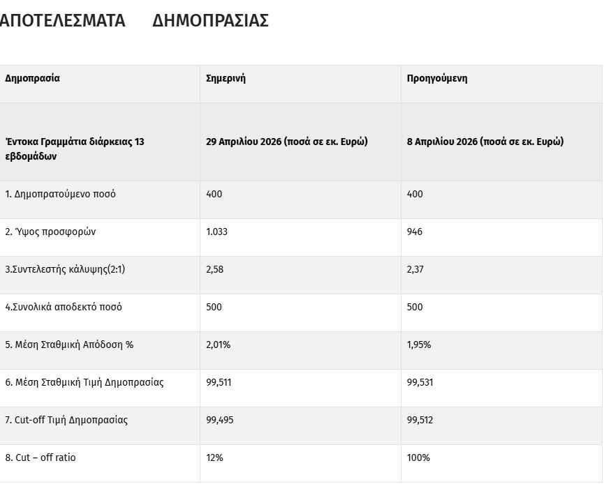Η δημοπρασία πραγματοποιήθηκε μέσω των Βασικών Διαπραγματευτών Αγοράς (Primary Dealers), και η ημερομηνία διακανονισμού είναι η Δευτέρα 4 Μαΐου 2026.