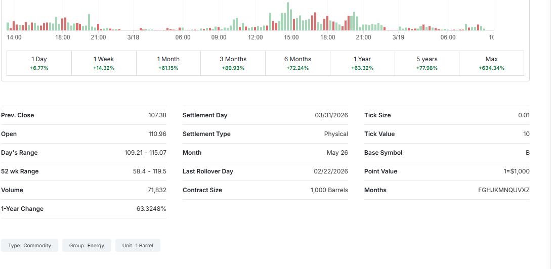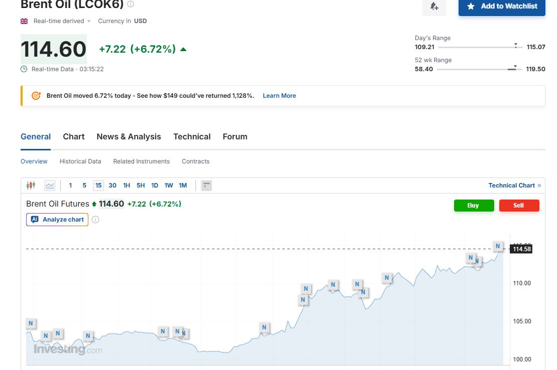 Ειδικότερα, όπως μετέδωσε το investing.com, σήμερα στις 9.15 π.μ ώρα Ελλάδας η τιμή του αργού αυξήθηκε κατά 6,72% και ανήλθε στα 114,60 δολάρια το βαρέλι από 110,96 δολάρια το βαρέλι που ήταν στο άνοιγμα. Επίσης επισημαίνεται πως χθες το brent έκλεισε με 107,38 δολάρια το βαρέλι.