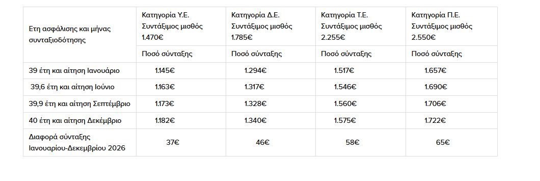 Για τους δημοσίους υπαλλήλους με συντάξιμες αποδοχές από 1.390 ευρώ έως 2.550 ευρώ, οι διαφορές στη σύνταξη για το 2026 μπορεί να φτάσουν στα 65 ευρώ, ανάλογα με τον μήνα που θα συνταξιοδοτηθούν.