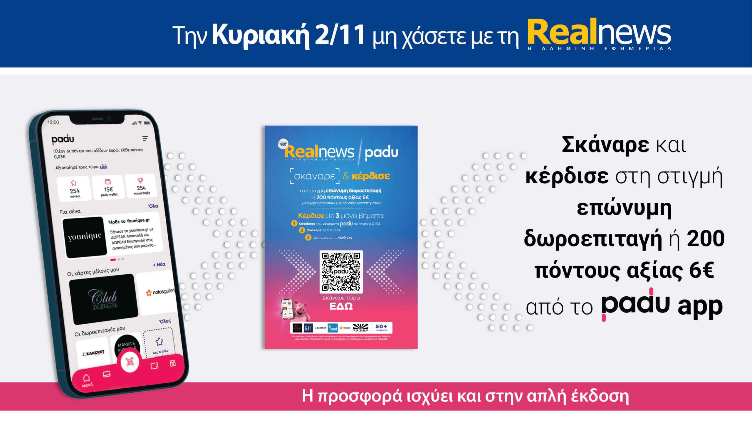Σκάναρε και κέρδισε στη στιγμή επώνυμη δωροεπιταγή ή 200 πόντους αξίας 6€ για αγορές από επώνυμες αλυσίδες καταστημάτων με το padu app.