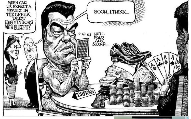 Αυτή τη φορά, ο κ. Τσίπρας παρουσιάζεται να κάθεται γυμνός σε ένα τραπέζι και να παίζει χαρτιά. Κι ενώ σκέφτεται πως ο παίκτης απέναντί του «θα υποχωρήσει όπου να’ ναι», δύο άλλα πρόσωπα που βρίσκονται πίσω του συζητούν: «Πότε να περιμένουμε αποτέλεσμα στη διαπραγμάτευση της Ελλάδας με την Ευρώπη για το χρέος;», ρωτά η γυναίκα, με τον άντρα να απαντά: «Σύντομα, πιστεύω».