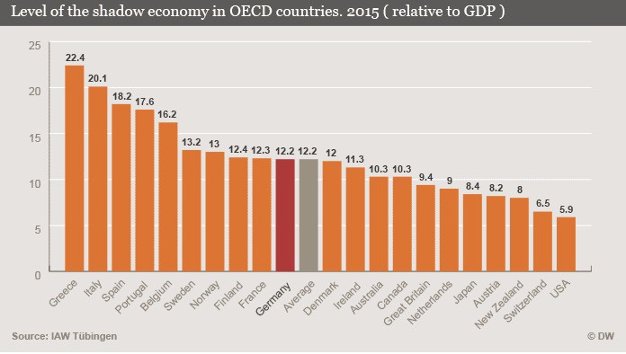 9. Την ίδια στιγμή, η κυβέρνηση δεν εισπράττει αρκετά έσοδα. Πώς το ξέρουμε αυτό; Η Ελλάδα έχει τη μεγαλύτερη – ως ποσοστό της οικονομίας – μαύρη παραοικονομία.