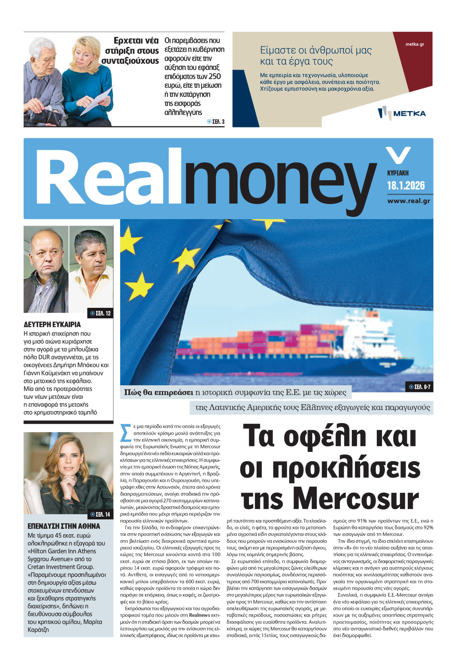 – Τι φέρνει η συμφωνία Mercosur. Τα οφέλη και τα γκρίζα σημεία για τους Ελληνες εξαγωγείς και τους καταναλωτές. Το άνοιγμα στις αγορές της Λατινικής Αμερικής, σε συνδυασμό με τους μειωμένους δασμούς, αναμένεται να δώσει ώθηση σε μια σειρά από ελληνικά προϊόντα, όπως το ελαιόλαδο, οι ελιές και τα γαλακτοκομικά. Οι εισαγωγές από τις χώρες με τις οποίες συμφώνησε η Ε.Ε. εκτιμάται ότι θα οδηγήσουν σε μείωση των τιμών στον καφέ, στη σόγια και στο βόειο κρέας.