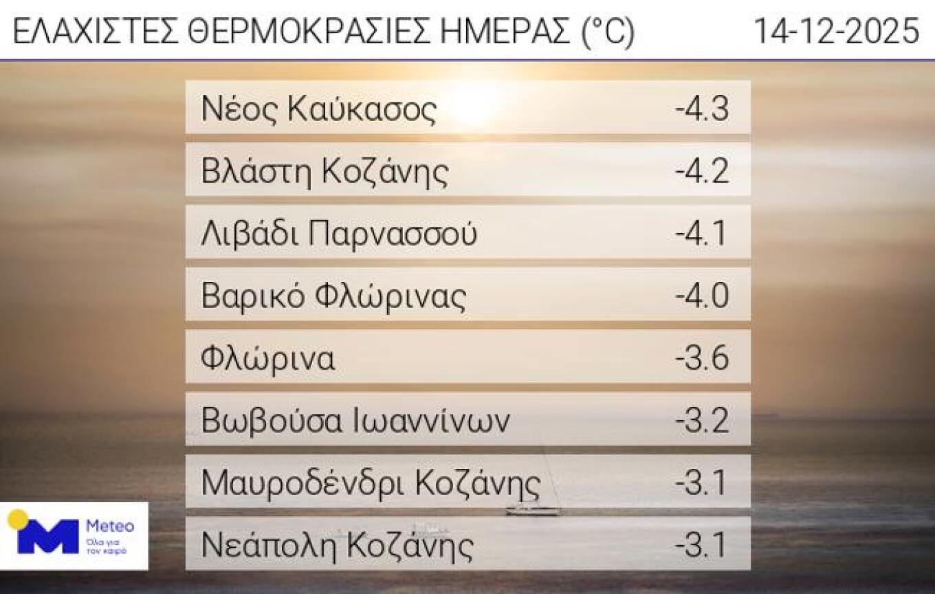 Παγετός σημειώθηκε το πρωί της Κυριακής 14 Δεκεμβρίου σε αρκετές περιοχές των κεντρικών και βόρειων ηπειρωτικών. Η χαμηλότερη θερμοκρασία καταγράφηκε στον Νέο Καύκασο της Δυτικής Μακεδονίας, όπου το θερμόμετρο έπεσε στους -4,3 βαθμούς Κελσίου. Συνολικά, οκτώ σταθμοί του δικτύου αυτόματων μετεωρολογικών σταθμών του meteo.gr και του Εθνικού Αστεροσκοπείου Αθηνών κατέγραψαν τιμές κάτω από το μηδέν, επιβεβαιώνοντας τις συνθήκες παγετού στις συγκεκριμένες περιοχές.