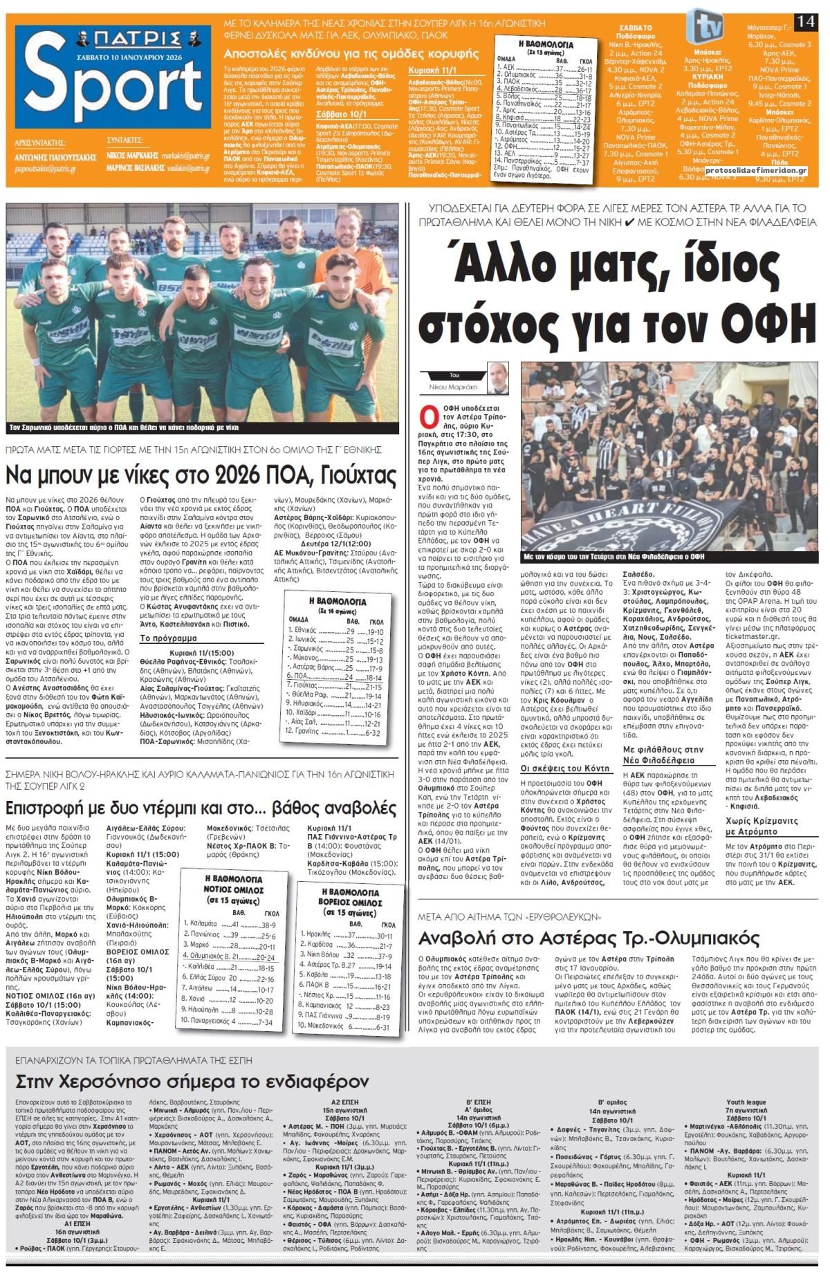 Διαβάστε τα πρωτοσέλιδα από τις αθλητικές εφημερίδες, σήμερα 10/1/2026.