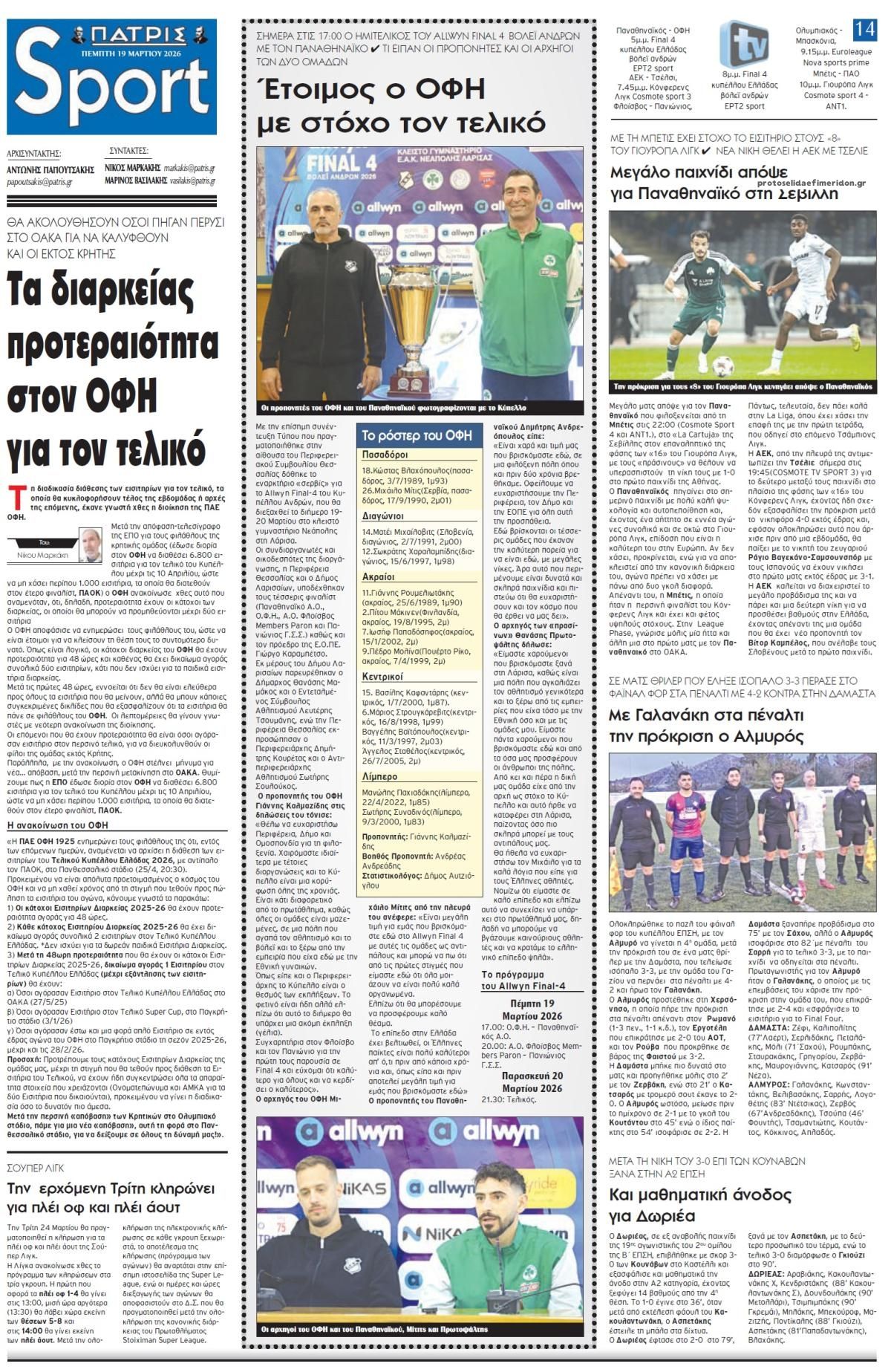 share Οι αθλητικές εφημερίδες 19/3/2026 δημοσιεύτηκε: 08:55 , 19 Μαρτίου 2026 Επικαιρότητα Διαβάστε τα πρωτοσέλιδα από τις αθλητικές εφημερίδες, σήμερα 19/3/2026. #ΑΘΛΗΤΙΚΕΣ ΕΦΗΜΕΡΙΔΕΣ #ΕΦΗΜΕΡΙΔΕΣ #ΠΡΩΤΟΣΕΛΙΔΑ share Σχόλια Αναγνωστών σχολίασε και εσύ Ακολουθήστε το στο Google News και μάθετε πρώτοι όλες τις ειδήσεις Δείτε όλες τις τελευταίες Ειδήσεις από την Ελλάδα και τον Κόσμο στο Ροή Οικονομία Επιχειρήσεις Επικαιρότητα 2 λεπτά πριν Φορολογικές δηλώσεις 2026: Παράταση της προθεσμίας υποβολής για την έκπτωση φόρου 4% 32 λεπτά πριν Πετρέλαιο: Στο υψηλότερο επίπεδο από τις 9 Μαρτίου η τιμή του brent – Οι εκτιμήσεις των αναλυτών 59 λεπτά πριν Ειδικός Φόρος Κατανάλωσης και fuel pass: Τι εξετάζεται – Οι τελευταίες πληροφορίες 1 ώρα πριν Ευρωπαϊκό Συμβούλιο: Ποια θέματα βρίσκονται στην ατζέντα της συνεδρίασης – Tι θα πει ο Κυριάκος... 4 ώρες πριν Νέος εξωδικαστικός: Νέα ρύθμιση για την πρώτη κατοικία – Τι αναφέρει η δικηγόρος Κατερίνα... 14 ώρες πριν Τι εξετάζει η κυβέρνηση για τα ακτοπλοϊκά εισιτήρια – Παρεμβάσεις σε 5 άξονες 3 ημέρες πριν Υπερταμείο: Αυτός είναι ο νέος διευθύνων σύμβουλος των ΕΛΤΑ 7 ημέρες πριν ΔΕΠΑ Εμπορίας: Νέο φορτίο LNG από τις ΗΠΑ στη Ρεβυθούσα 1 εβδομάδα πριν Νέα διεθνής επένδυση του Θοδωρή Κυριακού στην πλατφόρμα Uncensored του Piers Morgan 18 ώρες πριν Βουλή: Κατατέθηκε το νομοσχέδιο με τις «παρεμβάσεις για ένα κράτος πιο φιλικό στον πολίτη» – Τι... 1 ημέρα πριν Ταξί: Συνεχίζεται η απεργία – Τα αιτήματα των οδηγών 1 ημέρα πριν ΕΣΥ: Σήμερα απεργούν οι γιατροί – Τα αιτήματά τους ENIKOS NETWORK Ισραήλ: Οι IDF κατέστρεψαν στρατιωτικό ελικόπτερο Mi-17 σε αεροδρόμιο του Ιράν – Βίντεο από τη στιγμή του πλήγματος Φορολογικές δηλώσεις 2026: Παράταση της προθεσμίας υποβολής για την έκπτωση φόρου 4% Με ποιες χρόνιες παθήσεις συνδέεται το άγχος στην παιδική ηλικία – Ανησυχητική νέα μελέτη Καπνός και αλκοόλ: Καθολική απαγόρευση πώλησης σε ανηλίκους-Ψηφιακή επαλήθευση ηλικίας Προσοχή στο Gmail: Ο λογαριασμός σας κινδυνεύει με διαγραφή Σιρόπι προκάλεσε κυκλοφοριακό χάος – Τμήμα αυτοκινητοδρόμου παρέμεινε κλειστό για σχεδόν εννέα ώρες περισσότερα 09:10 , 12 Ιανουαρίου 2026 || Καιρός: Χιόνια και πολικές θερμοκρασίες σήμερα – Η πρόγνωση της ΕΜΥ Έντονο κύμα ψύχους θα επικρατήσει στη χώρα τη Δευτέρα με χαμηλές θερμοκρασίες. Χιονοπτώσεις αναμέ... 09:03 , 8 Δεκεμβρίου 2025 || Καιρός: Ισχυρές βροχές και καταιγίδες στην Κρήτη σήμερα – Αναλυτική πρόγνωση ανά περιοχή Ισχυρές βροχές και καταιγίδες προβλέπονται σήμερα, Δευτέρα 8 Δεκεμβρίου 2025 στη βόρεια Κρήτη σύμ... 15:10 , 23 Νοεμβρίου 2025 || Αυτή την Κυριακή με τη Realnews: Δωροεπιταγή 10€ Δωροεπιταγή αξίας 10€ για αγορές άνω των 60€ από τα πολυκαταστήματα Factory Outlet. H προσφορά ισ... 09:40 , 23 Νοεμβρίου 2025 || Αυτή την Κυριακή με τη Realnews: Instyle, μαζί Drive Αυτή την Κυριακή με τη Realnews: Instyle, μαζί Drive Instyle Η Κατερίνα Παπουτσάκη, η Helena Bac... 17:49 , 24 Σεπτεμβρίου 2025 || Ελληνικές Υπεραγορές Σκλαβενίτης: Τι απαντά για το πρόστιμο ύψους 1,44 εκατ. ευρώ Ανακοίνωση εξέδωσε η “Ελληνικές Υπεραγορές Σκλαβενίτης” σχετικά με το πρόστιμο ύψους ... 10:16 , 21 Σεπτεμβρίου 2025 || Σήμερα με τη Realnews: Instyle – Μαζί Drive Σήμερα με τη Realnews: Instyle, μαζί Drive Instyle Η Andie MacDowell, η Renate Reinsve και ο Οδυ... 12:05 , 7 Σεπτεμβρίου 2025 || Σήμερα με τη Realnews: Απόκρυφες τελετές της Debra Bokur – Μαζί Real taste & style Αυτή την Κυριακή με τη Realnews: Απόκρυφες τελετές της Debra Bokur, μαζί Real taste & style. ... 22:08 , 30 Αυγούστου 2025 || Ξεκινά η κατασκευή του νέου αυτοκινητοδρόμου Ιωάννινα- Κακαβιά Μέ