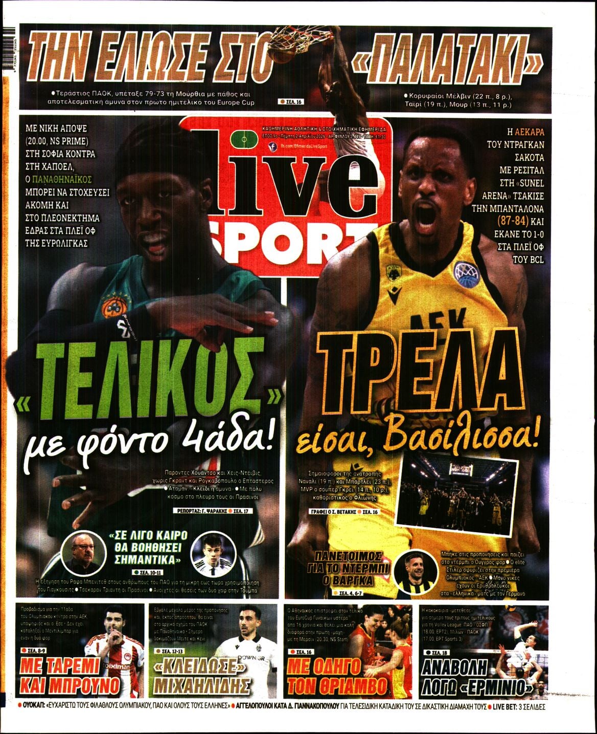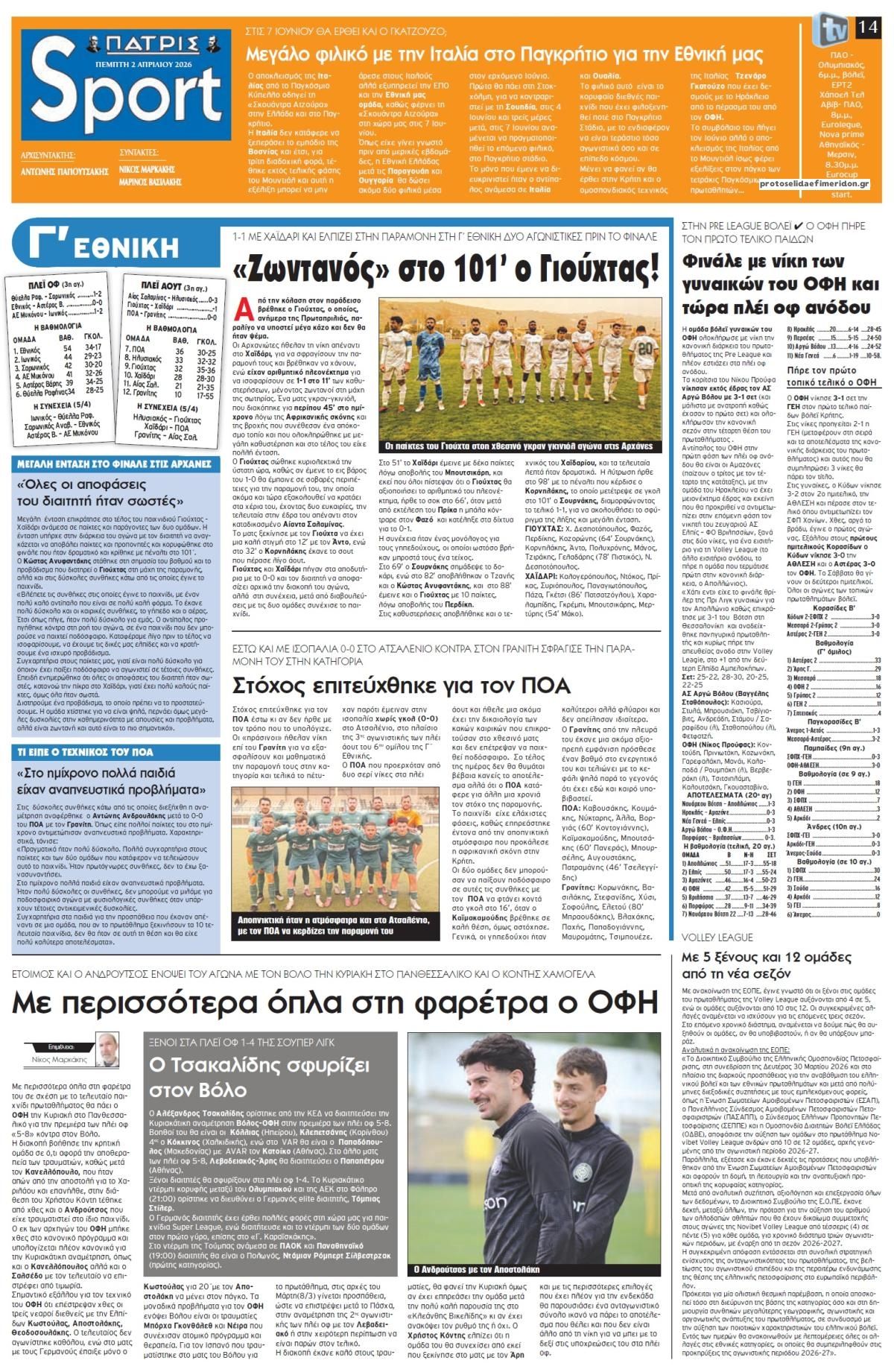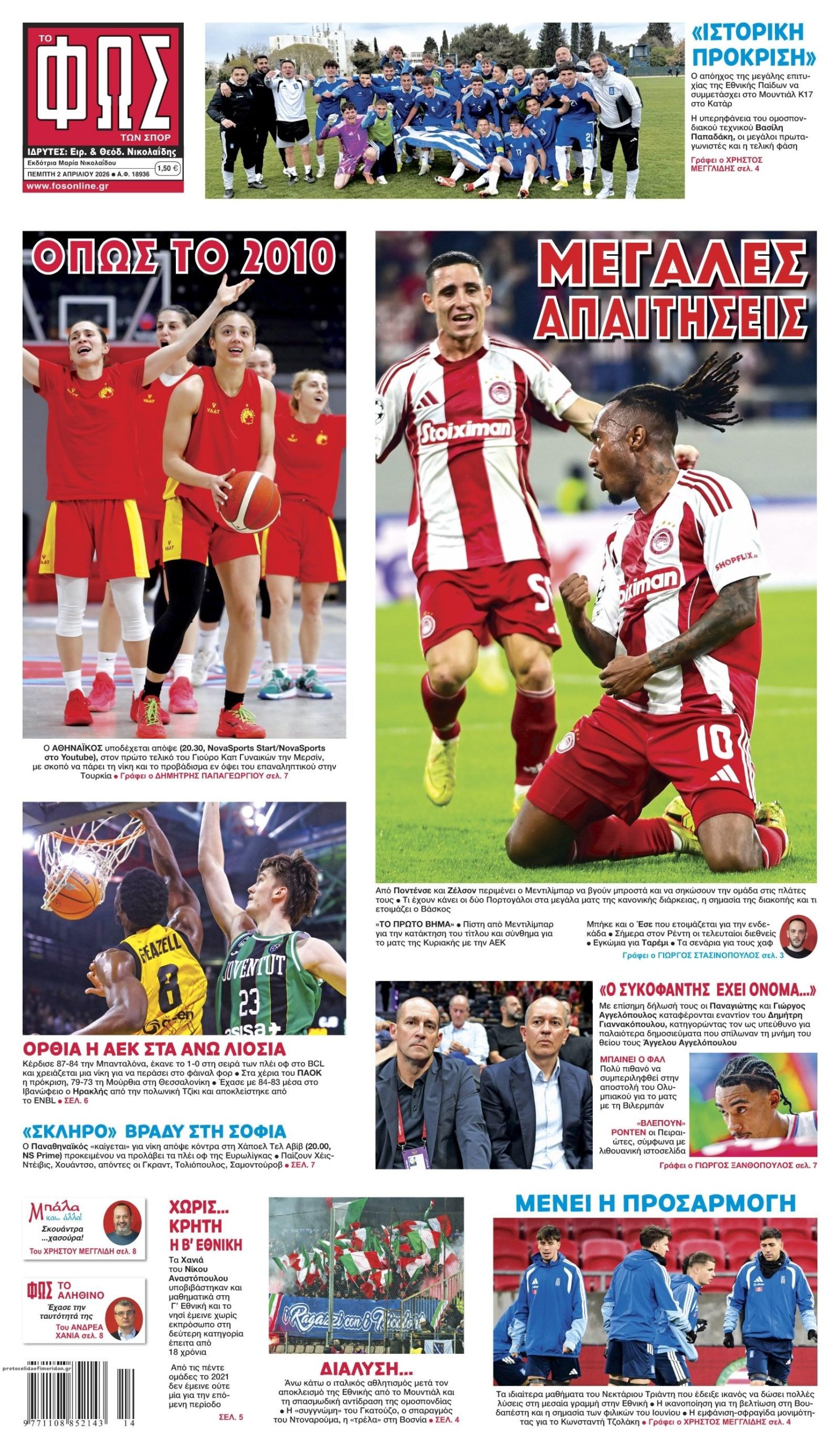 share Οι αθλητικές εφημερίδες 2/4/2026 δημοσιεύτηκε: 09:00 , 2 Απριλίου 2026 Επικαιρότητα Διαβάστε τα πρωτοσέλιδα από τις αθλητικές εφημερίδες, σήμερα 2/4/2026 #ΑΘΛΗΤΙΚΕΣ ΕΦΗΜΕΡΙΔΕΣ #ΕΦΗΜΕΡΙΔΕΣ share Οι οικονομικές εφημερίδες 2/4/2026 Επίδομα εργασίας από τη ΔΥΠΑ: Τα «μυστικά» που πρέπει να γνωρίζετε για τη χορήγησή του – Τα νέα ποσά και η φορολόγηση Νέος κύκλος προσλήψεων στο Δημόσιο – Τι λέει ο πρόεδρος του ΑΣΕΠ για τις προκηρύξεις που έρχονται Τέλη κυκλοφορίας με τον μήνα: Πώς γίνεται η ψηφιακή άρση ακινησίας οχημάτων – Αναλυτικός οδηγός Πιερρακάκης: Τα μέτρα που ενεργοποιούνται σήμερα δεν είναι το τέλος, αλλά η αρχή μιας διαρκούς στήριξης Σχόλια Αναγνωστών σχολίασε και εσύ Ακολουθήστε το στο Google News και μάθετε πρώτοι όλες τις ειδήσεις Δείτε όλες τις τελευταίες Ειδήσεις από την Ελλάδα και τον Κόσμο στο Ροή Οικονομία Επιχειρήσεις Επικαιρότητα 17 λεπτά πριν Πάσχα 2026: Σήμερα η πρεμιέρα για το εορταστικό ωράριο – Πώς θα λειτουργήσουν τα καταστήματα 46 λεπτά πριν Επιδόματα και Δώρο Πάσχα από τη ΔΥΠΑ: Από σήμερα αρχίζει η προπληρωμή 1 ώρα πριν Καιρός: Ισχυροί άνεμοι, βροχές και καταιγίδες – Πού θα χτυπήσει το δεύτερο κύμα της κακοκαιρίας... 46 λεπτά πριν Επιδόματα και Δώρο Πάσχα από τη ΔΥΠΑ: Από σήμερα αρχίζει η προπληρωμή 3 ώρες πριν Τέλη κυκλοφορίας με τον μήνα: Πώς γίνεται η ψηφιακή άρση ακινησίας οχημάτων – Αναλυτικός οδηγός 11 ώρες πριν Νέος κύκλος προσλήψεων στο Δημόσιο – Τι λέει ο πρόεδρος του ΑΣΕΠ για τις προκηρύξεις που... 19 ώρες πριν ΔΕΗ: Στα 0,138 ευρώ /kWh το πράσινο τιμολόγιο ρεύματος τον Απρίλιο – Τι ισχύει για τα μπλε 3 ημέρες πριν Υπερταμείο: Εγκρίθηκε η αύξηση μετοχικού κεφαλαίου της CrediaBank 1 εβδομάδα πριν Motor Oil: Διαφοροποίηση των πηγών προμήθειας αργού λόγω της κρίσης 17 λεπτά πριν Πάσχα 2026: Σήμερα η πρεμιέρα για το εορταστικό ωράριο – Πώς θα λειτουργήσουν τα καταστήματα 1 ώρα πριν Καιρός: Ισχυροί άνεμοι, βροχές και καταιγίδες – Πού θα χτυπήσει το δεύτερο κύμα της κακοκαιρίας... 2 ώρες πριν Οι αθλητικές εφημερίδες 2/4/2026 ENIKOS NETWORK ΕΦΕΤ: Καμία εμπλοκή στο περιστατικό παράνομης εκτροφής ζώων σε ταράτσα κτιρίου στους Αμπελόκηπους Στο real taste & style που κυκλοφορεί με τη Realnews Διαβήτης: Χιλιάδες ασθενείς στην Ελλάδα χωρίς πρόσβαση σε σύγχρονες τεχνολογίες παρακολούθησης γλυκόζης Νέα παραλλαγή COVID «τζιτζίκι»: Ποια συμπτώματα προκαλεί και τι πρέπει να προσέξετε Google: Αρχίζει η επαλήθευση προγραμματιστών Android – Η διαδικασία και η πλευρά της Apple Ρομπότ με πόδια: Ο νέος «εξερευνητής» που επιταχύνει την αναζήτηση ζωής στον Άρη και πόρων στη Σελήνη περισσότερα 10:15 || Επικαιρότητα Πάσχα 2026: Σήμερα η πρεμιέρα για το εορταστικό ωράριο – Πώς θα λειτουργήσουν τα καταστήματα Σήμερα κάνει πρεμιέρα το εορταστικό ωράριο λειτουργίας των εμπορικών καταστημάτων για την περίοδο... 09:15 || Επικαιρότητα Καιρός: Ισχυροί άνεμοι, βροχές και καταιγίδες – Πού θα χτυπήσει το δεύτερο κύμα της κακοκαιρίας «Erminio» Βροχές και καταιγίδες επιφυλάσσει ο καιρός και σήμερα Πέμπτη 2 Απριλίου, καθώς μαίνεται το δεύτε... 08:35 || Επικαιρότητα Οι πολιτικές εφημερίδες 2/4/2026 Διαβάστε τα πρωτοσέλιδα από τις πολιτικές εφημερίδες, σήμερα 2/4/2026. 08:15 || Επικαιρότητα Οι οικονομικές εφημερίδες 2/4/2026 Διαβάστε τα πρωτοσέλιδα από τις οικονομικές εφημερίδες, σήμερα 2/4/2026 34 &... 15:40 , 1 Απριλίου 2026 || Επικαιρότητα Πάσχα 2026: Αύριο η πρεμιέρα για το εορταστικό ωράριο – Πώς θα λειτουργήσουν τα καταστήματα Από αύριο, Πέμπτη 2 Απριλίου θ