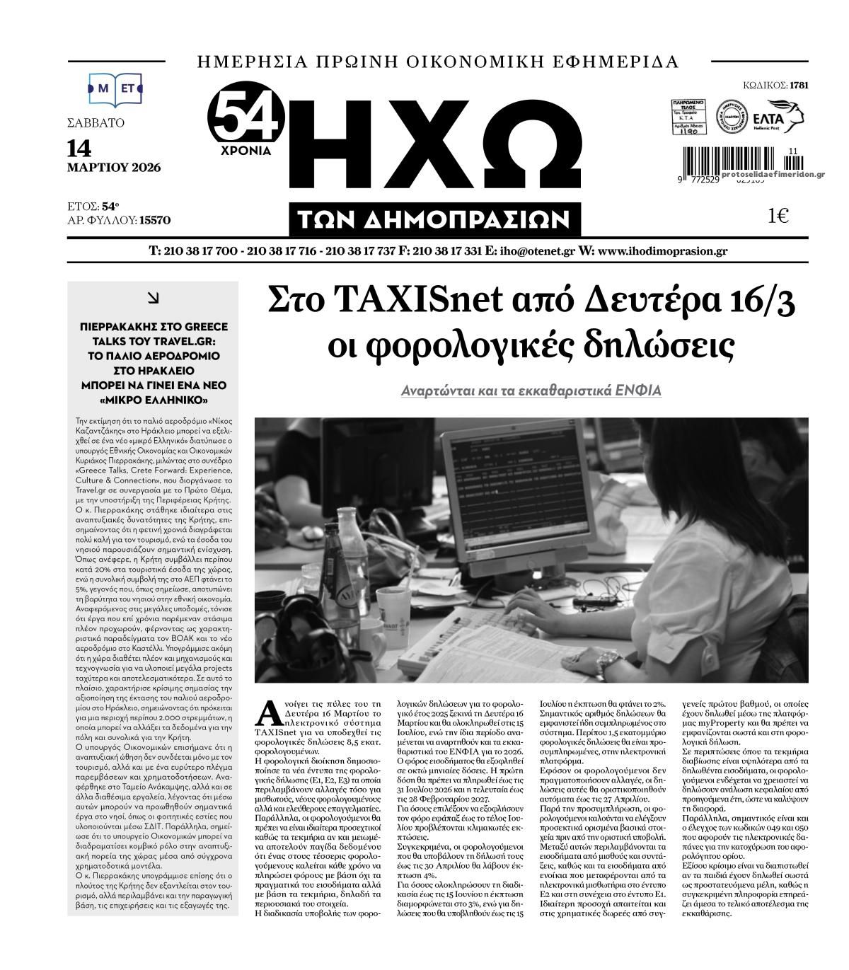 share Οι οικονομικές εφημερίδες 14/3/2026 δημοσιεύτηκε: 08:30 , 14 Μαρτίου 2026 Επικαιρότητα Διαβάστε τα πρωτοσέλιδα από τις οικονομικές εφημερίδες, σήμερα 14/3/2026. #ΕΦΗΜΕΡΙΔΕΣ #ΟΙΚΟΝΟΜΙΚΕΣ ΕΦΗΜΕΡΙΔΕΣ #ΠΡΩΤΟΣΕΛΙΔΑ share Τακτικό επίδομα ανεργίας ύψους 540 ευρώ από τη ΔΥΠΑ: Ποιες αλλαγές έρχονται Οικονομικό Επιμελητήριο Ελλάδος: 5 προτάσεις και μεταβατικός χρόνος για την επίλυση των προβλημάτων σε ΕΡΓΑΝΗ ΙΙ και ΑΡΙΑΔΝΗ ΥΠΕΝ: Παρατάσεις στις προθεσμίες ολοκλήρωσης ενεργειακών προγραμμάτων του Ταμείου Ανάκαμψης Εφιάλτης αντί για «όνειρο»: Πώς ο πόλεμος στη Μέση Ανατολή τινάζει στον αέρα τα σχέδια χιλιάδων ταξιδιωτών Σχόλια Αναγνωστών σχολίασε και εσύ Ακολουθήστε το στο Google News και μάθετε πρώτοι όλες τις ειδήσεις Δείτε όλες τις τελευταίες Ειδήσεις από την Ελλάδα και τον Κόσμο στο Ροή Οικονομία Επιχειρήσεις Επικαιρότητα 24 λεπτά πριν Φορολογικές δηλώσεις 2026: Τη Δευτέρα αρχίζει η υποβολή τους -Τι πρέπει να γνωρίζετε για τα... 1 ώρα πριν ΑΑΔΕ: Τι αναφέρει το αναθεωρημένο Στρατηγικό Σχέδιο της Αρχής για 2025-2029 4 ώρες πριν Τακτικό επίδομα ανεργίας ύψους 540 ευρώ από τη ΔΥΠΑ: Ποιες αλλαγές έρχονται 1 ώρα πριν ΑΑΔΕ: Τι αναφέρει το αναθεωρημένο Στρατηγικό Σχέδιο της Αρχής για 2025-2029 12 ώρες πριν Οικονομικό Επιμελητήριο Ελλάδος: 5 προτάσεις και μεταβατικός χρόνος για την επίλυση των... 13 ώρες πριν ΥΠΕΝ: Παρατάσεις στις προθεσμίες ολοκλήρωσης ενεργειακών προγραμμάτων του Ταμείου Ανάκαμψης 2 ημέρες πριν ΔΕΠΑ Εμπορίας: Νέο φορτίο LNG από τις ΗΠΑ στη Ρεβυθούσα 3 ημέρες πριν Νέα διεθνής επένδυση του Θοδωρή Κυριακού στην πλατφόρμα Uncensored του Piers Morgan 3 ημέρες πριν ΔΕΣΦΑ: Δεν τίθεται ζήτημα εφοδιασμού με φυσικό αέριo – Tι αναφέρουν πηγές της διοίκησης για τον... 4 ημέρες πριν ΑΑΔΕ: Ποιες ψηφιακές εφαρμογές είναι έως σήμερα εκτός λειτουργίας 5 ημέρες πριν Αυτή την Κυριακή δύο βιβλία με τη Realnews: Στις μυστικές υπηρεσίες της Μαρίας Αντουανέτας – Τα... 6 ημέρες πριν Μητσοτάκης: Θα παρέμβουμε αμέσως και δυναμικά σε κάθε φαινόμενο κερδοσκοπίας – Η εβδομαδιαία... ENIKOS NETWORK Στον εισαγγελέα οδηγείται ο 23χρονος για τη δολοφονία του 20χρονου στη Θεσσαλονίκη – «Προφανώς υπάρχει κάτι που δεν έχει αν... Ιράκ: Οι πρώτες εικόνες από τις ζημιές στην αμερικανική πρεσβεία στη Βαγδάτη μετά την επίθεση Μεταμόσχευση μαλλιών: Ο 33χρονος που έδειχνε 40 και τώρα τον περνούν για 20άρη – Δείτε την απίστευτη μεταμόρφωση Το μυστικό για μόνιμο αδυνάτισμα δεν κρύβεται στις θερμίδες – Η ανατρεπτική θεωρία του Dr. Jason Fung CISO Executive Toolkit: Ένας πλήρης οδηγός για την ασφάλεια στο διαδίκτυο Jessica Adams: Πρόβλεψη σοκ από τη γνωστή αστρολόγο – Ο παγκόσμιος χάρτης θα ξαναγραφτεί το 2026 περισσότερα 09:10 , 12 Ιανουαρίου 2026 || Καιρός: Χιόνια και πολικές θερμοκρασίες σήμερα – Η πρόγνωση της ΕΜΥ Έντονο κύμα ψύχους θα επικρατήσει στη χώρα τη Δευτέρα με χαμηλές θερμοκρασίες. Χιονοπτώσεις αναμέ... 09:03 , 8 Δεκεμβρίου 2025 || Καιρός: Ισχυρές βροχές και καταιγίδες στην Κρήτη σήμερα – Αναλυτική πρόγνωση ανά περιοχή Ισχυρές βροχές και καταιγίδες προβλέπονται σήμερα, Δευτέρα 8 Δεκεμβρίου 2025 στη βόρεια Κρήτη σύμ... 15:10 , 23 Νοεμβρίου 2025 || Αυτή την Κυριακή με τη Realnews: Δωροεπιταγή 10€ Δωροεπιταγή αξίας 10€ για αγορές άνω των 60€ από τα πολυκαταστήματα Factory Outlet. H προσφορά ισ... 09:40 , 23 Νοεμβρίου 2025 || Αυτή την Κυριακή με τη Realnews: Instyle, μαζί Drive Αυτή την Κυριακή με τη Realnews: Instyle, μαζί Drive Instyle Η Κατερίνα Παπουτσάκη, η Helena Bac... 17:49 , 24 Σεπτεμβρίου 2025 || Ελληνικές Υπεραγορές Σκλαβενίτης