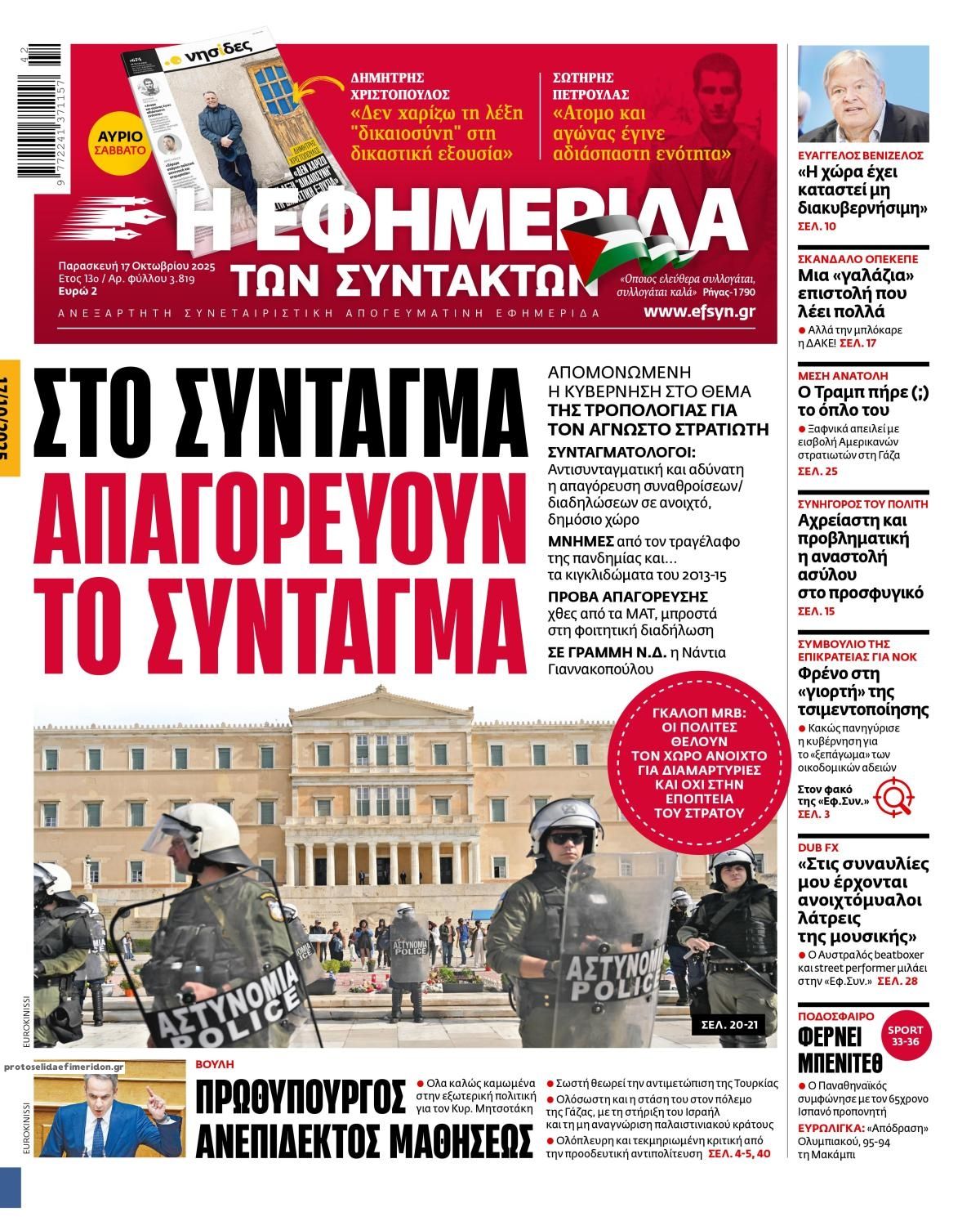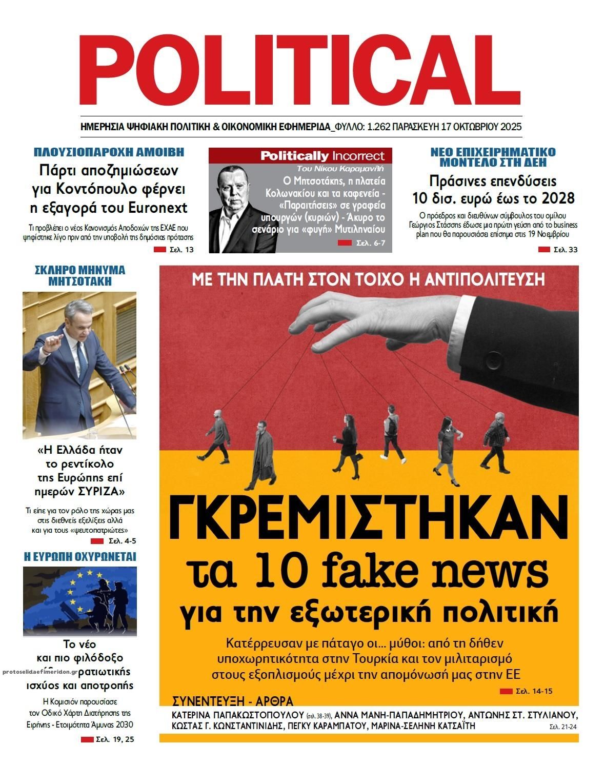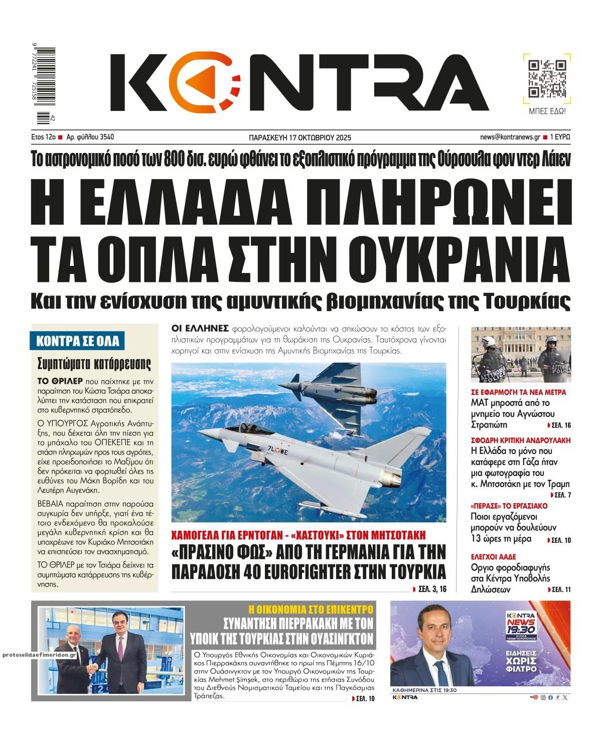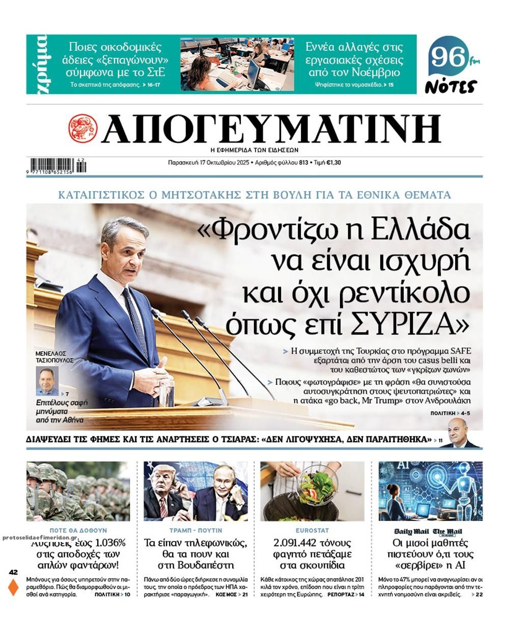 share Οι πολιτικές εφημερίδες 17/10/2025 δημοσιεύτηκε: 08:25 , 17 Οκτωβρίου 2025 Επικαιρότητα Διαβάστε τα πρωτοσέλιδα από τις πολιτικές εφημερίδες, σήμερα 17/10/2025. #ΠΟΛΙΤΙΚΕΣ ΕΦΗΜΕΡΙΔΕΣ #ΠΡΩΤΟΣΕΛΙΔΑ share Σχολάζουσες κληρονομιές: Ποιες αλλαγές έρχονται ως προς την εκκαθάριση – Τι είπε ο Όμηρος Τσάπαλος Οικόπεδα: Επιστολή της ΠΟΜΙΔΑ προς το υπουργείο Δικαιοσύνης – Τι αναφέρει Fitch: Γιατί ο οίκος δίνει “σήμα “για νέα αναβάθμιση του αξιόχρεου της Ελλάδας Σχόλια Αναγνωστών σχολίασε και εσύ Ακολουθήστε το στο Google News και μάθετε πρώτοι όλες τις ειδήσεις Δείτε όλες τις τελευταίες Ειδήσεις από την Ελλάδα και τον Κόσμο στο Ροή Οικονομία Επιχειρήσεις Επικαιρότητα 2 ώρες πριν Επίδομα στέγασης 2025: Ποιοι κινδυνεύουν να «κοπούν» στις πληρωμές του Οκτωβρίου και του Νοεμβρίου 9 ώρες πριν Standard and Poor’s: Επιβεβαίωσε το αξιόχρεο της Ελλάδας στο ΒΒΒ με σταθερές προοπτικές 11 ώρες πριν ΕΒΕΠ: Τι δείχνει το φθινοπωρινό βαρόμετρο για τις Μικρομεσαίες Επιχειρήσεις στην ΕΕ 9 ώρες πριν Standard and Poor’s: Επιβεβαίωσε το αξιόχρεο της Ελλάδας στο ΒΒΒ με σταθερές προοπτικές 11 ώρες πριν ΕΒΕΠ: Τι δείχνει το φθινοπωρινό βαρόμετρο για τις Μικρομεσαίες Επιχειρήσεις στην ΕΕ 12 ώρες πριν Η νέα «ακτινογραφία» της αγοράς: Πρωταθλητές στις μεταβιβάσεις τα παλαιότερα ακίνητα 3 ημέρες πριν ΑΔΜΗΕ: Σε λειτουργία το νέο Επιχειρησιακό Κέντρο Επιτήρησης Υποδομών και Εγκαταστάσεων 4 ημέρες πριν ΕΒΕΑ: Έως 31 Δεκεμβρίου 2025 η προθεσμία συμμόρφωσης εταιρειών του ΓΕΜΗ 5 ημέρες πριν ΟΠΑΠ- Allwyn: Ενώνουν δυνάμεις και δημιουργούν έναν παγκόσμιο κολοσσό 16 δισ. ευρώ – Η δήλωση... 15 ώρες πριν GSI: Νέα σύσκεψη για την ηλεκτρική διασύνδεση Ελλάδας – Κύπρου – Τι συζητήθηκε 2 ημέρες πριν Προσλήψεις σε βρεφονηπιακούς σταθμούς της ΔΥΠΑ: Μπείτε εδώ για να δείτε τους νέους πίνακες 2 ημέρες πριν Τεράστια απάτη σε βάρος του ΕΦΚΑ μέσω εταιρειών ρούχων: Πάνω από 2 εκατ. ευρώ η ζημιά ENIKOS NETWORK Το ChatGPT πάει… σχολείο: Από 20 λύκεια της χώρας ξεκινά το «AI in Schools» – Τα 3+1 στάδια της εφαρμογής του προγράμματος Βίντεο: Η στιγμή που 27χρονη Αλγερινή ανοίγει τη βαλίτσα με το πτώμα 12χρονης που είχε δολοφονήσει στο Παρίσι «Δεν μπορούσα να φιλήσω τη σύζυγό μου επειδή η μύτη μου μεγάλωνε συνεχώς» – Η κοινή πάθηση του 68χρονου και πώς θεραπεύεται... Julianne Moore: Η πιο παράξενη συμβουλή γυμναστικής που της έδωσε προπονητής – Βοηθά σώμα και εγκέφαλο Jeremy Clarkson: Εξηγεί το αηδιαστικό πράγμα που τον «μπερδεύει» περισσότερο ως ιδιοκτήτης παμπ Τεστ παρατηρητικότητας: Μπορείτε να βρείτε τις 3 διαφορές στις εικόνες με ένα λιοντάρι σε 16 δευτερόλεπτα περισσότερα 17:49 , 24 Σεπτεμβρίου 2025 || Ελληνικές Υπεραγορές Σκλαβενίτης: Τι απαντά για το πρόστιμο ύψους 1,44 εκατ. ευρώ Ανακοίνωση εξέδωσε η “Ελληνικές Υπεραγορές Σκλαβενίτης” σχετικά με το πρόστιμο ύψους ... 10:16 , 21 Σεπτεμβρίου 2025 || Σήμερα με τη Realnews: Instyle – Μαζί Drive Σήμερα με τη Realnews: Instyle, μαζί Drive Instyle Η Andie MacDowell, η Renate Reinsve και ο Οδυ... 12:05 , 7 Σεπτεμβρίου 2025 || Σήμερα με τη Realnews: Απόκρυφες τελετές της Debra Bokur – Μαζί Real taste & style Αυτή την Κυριακή με τη Realnews: Απόκρυφες τελετές της Debra Bokur, μαζί Real taste & style. ... 22:08 , 30 Αυγούστου 2025 || Ξεκινά η κατασκευή του νέου αυτοκινητοδρόμου Ιωάννινα- Κακαβιά Μέχρι το τέλος του έτους ξεκινά η κατασκευή του νέου αυτοκινητοδρόμου Ιωάννινα-Κακαβιά που αποτελ... 07:30 , 24 Αυγούστου 2025 || Σήμερα με τη Realnews: Instyle – Μαζί Drive Αυτή την Κυριακή με τη Realnews: Instyle, μαζί Drive Instyle Νέα σεζόν. Νέες τάσεις. Νέα πρόσωπα... 14:05 , 16 Αυγούστου 2025 