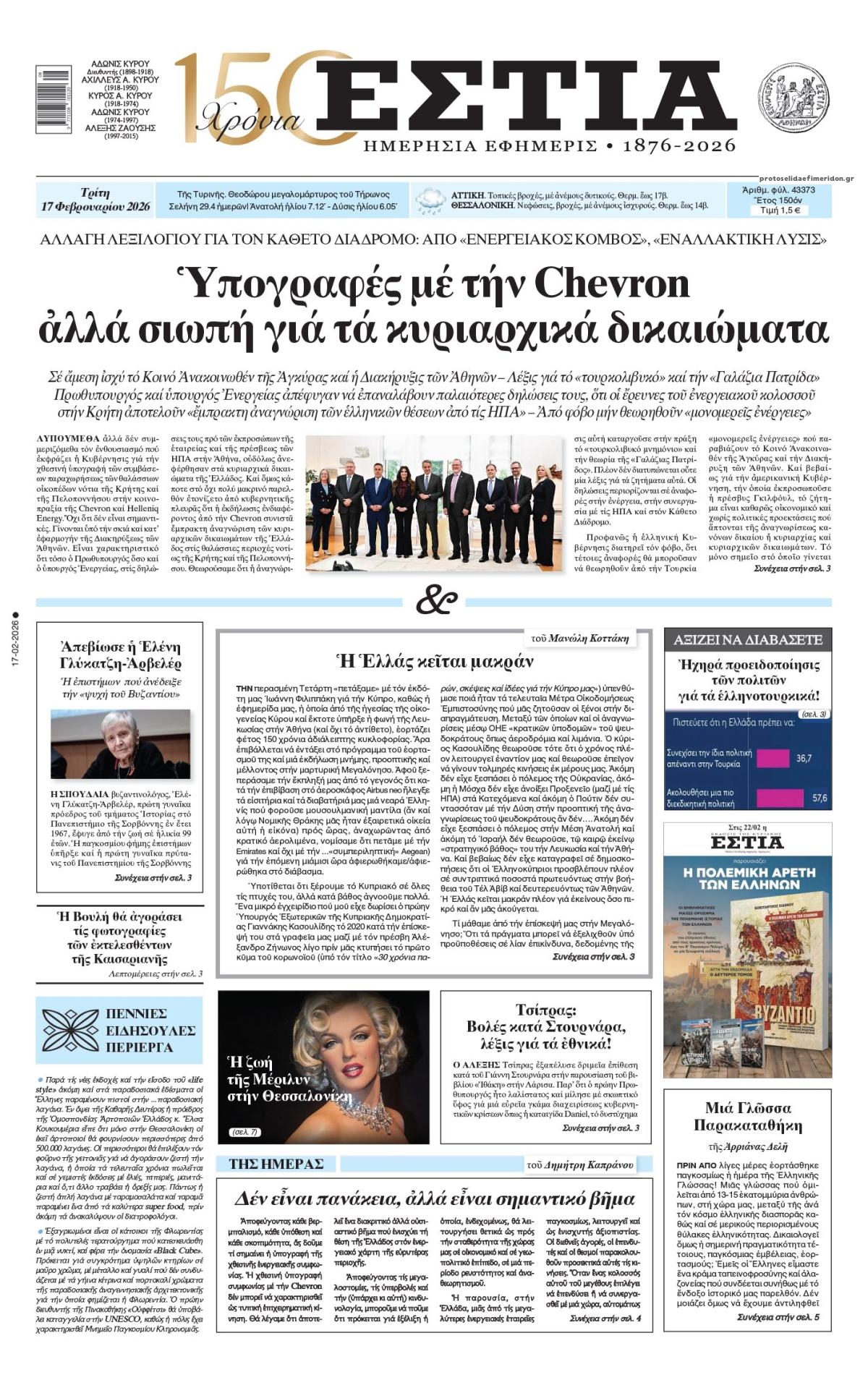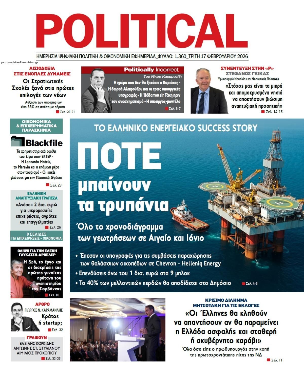 share Οι πολιτικές εφημερίδες 17/2/2026 δημοσιεύτηκε: 08:03 , 17 Φεβρουαρίου 2026 Επικαιρότητα Διαβάστε τα πρωτοσέλιδα από τις πολιτικές εφημερίδες, σήμερα 17/2/2026. #ΕΦΗΜΕΡΙΔΕΣ #ΠΟΛΙΤΙΚΕΣ ΕΦΗΜΕΡΙΔΕΣ #ΠΡΩΤΟΣΕΛΙΔΑ share Σχόλια Αναγνωστών σχολίασε και εσύ Ακολουθήστε το στο Google News και μάθετε πρώτοι όλες τις ειδήσεις Δείτε όλες τις τελευταίες Ειδήσεις από την Ελλάδα και τον Κόσμο στο Ροή Οικονομία Επιχειρήσεις Επικαιρότητα 15 λεπτά πριν Ελεύθεροι επαγγελματίες: Ποιες αλλαγές έρχονται στο έντυπο Ε3 και στον φορολογαριασμό 1 ώρα πριν Νέο πρόγραμμα για επιδοτήσεις επιχειρήσεων: Στις 19 Μαρτίου ανοίγει η πλατφόρμα για τις... 2 ώρες πριν Σταθερές ευρυζωνικές συνδέσεις: Άνοδο καταγράφει η Ελλάδα στην παγκόσμια κατάταξη ταχύτητας 15 λεπτά πριν Ελεύθεροι επαγγελματίες: Ποιες αλλαγές έρχονται στο έντυπο Ε3 και στον φορολογαριασμό 1 ώρα πριν Νέο πρόγραμμα για επιδοτήσεις επιχειρήσεων: Στις 19 Μαρτίου ανοίγει η πλατφόρμα για τις... 2 ώρες πριν Η ΑΑΔΕ εντείνει τη «μάχη» κατά της φοροδιαφυγής και της διαφθοράς-Ποιοι βρίσκονται στο στόχαστρο 2 ημέρες πριν Nέα εποχή για την ελληνική αμυντική βιομηχανία – Σε ποιους τομείς επικεντρώνεται το ενδιαφέρον... 5 ημέρες πριν Υπερταμείο: Στα 12 δισ. ευρώ το χαρτοφυλάκιο – Ποιες κινήσεις έγιναν το 2025 7 ημέρες πριν ΕΛΤΑ: Αυτά είναι τα πρώτα 11 καταστήματα που κατεβάζουν ρολά 2 ώρες πριν Σταθερές ευρυζωνικές συνδέσεις: Άνοδο καταγράφει η Ελλάδα στην παγκόσμια κατάταξη ταχύτητας 4 ώρες πριν Αττική: Νέα απεργία πραγματοποιούν από σήμερα οι οδηγοί και οι ιδιοκτήτες -Τι ζητούν 1 ημέρα πριν Ταξί: Σε νέα τριήμερη απεργία προχωρούν οι οδηγοί και οι ιδιοκτήτες στην Αττική – Ποια είναι τα... ENIKOS NETWORK Παναγιώτης Στάθης: Η συγκινητική ανάρτηση για τον θάνατο της μητέρας του – «Ο μοναδικός ήρωας που γνώρισα στη ζωή μου» Χρήστος Μαυρίκης: Ποινική δίωξη για τους πυροβολισμούς στον αέρα – Στο Αυτόφωρο η δίκη του Μήπως ο εγκέφαλός σας σάς παχαίνει; Οι έρευνες δείχνουν γιατί δεν μπορείτε να αδυνατίσετε Πότε να πάω στον γιατρό για τον πόνο στη μέση; Ειδικός του Cleveland απαντά Τεστ προσωπικότητας: Tο αντικείμενο που θα επιλέξετε αποκαλύπτει την τρέχουσα διάθεσή σας Τι σημαίνει η φράση «ένδον σκάπτε» και από πού προέρχεται περισσότερα 09:10 , 12 Ιανουαρίου 2026 || Καιρός: Χιόνια και πολικές θερμοκρασίες σήμερα – Η πρόγνωση της ΕΜΥ Έντονο κύμα ψύχους θα επικρατήσει στη χώρα τη Δευτέρα με χαμηλές θερμοκρασίες. Χιονοπτώσεις αναμέ... 09:03 , 8 Δεκεμβρίου 2025 || Καιρός: Ισχυρές βροχές και καταιγίδες στην Κρήτη σήμερα – Αναλυτική πρόγνωση ανά περιοχή Ισχυρές βροχές και καταιγίδες προβλέπονται σήμερα, Δευτέρα 8 Δεκεμβρίου 2025 στη βόρεια Κρήτη σύμ... 15:10 , 23 Νοεμβρίου 2025 || Αυτή την Κυριακή με τη Realnews: Δωροεπιταγή 10€ Δωροεπιταγή αξίας 10€ για αγορές άνω των 60€ από τα πολυκαταστήματα Factory Outlet. H προσφορά ισ... 09:40 , 23 Νοεμβρίου 2025 || Αυτή την Κυριακή με τη Realnews: Instyle, μαζί Drive Αυτή την Κυριακή με τη Realnews: Instyle, μαζί Drive Instyle Η Κατερίνα Παπουτσάκη, η Helena Bac... 17:49 , 24 Σεπτεμβρίου 2025 || Ελληνικές Υπεραγορές Σκλαβενίτης: Τι απαντά για το πρόστιμο ύψους 1,44 εκατ. ευρώ Ανακοίνωση εξέδωσε η “Ελληνικές Υπεραγορές Σκλαβενίτης” σχετικά με το πρόστιμο ύψους ... 10:16 , 21 Σεπτεμβρίου 2025 || Σήμερα με τη Realnews: Instyle – Μαζί Drive Σήμερα με τη Realnews: Instyle, μαζί Drive Instyle Η Andie MacDowell, η Renate Reinsve και ο Οδυ... 12:05 , 7 Σεπτεμβρίου 2025 || Σήμερα με τη Realnews: Απόκρυφες τελετές της Debra Bokur – Μαζί Real taste & style Αυτή την Κυριακή με τη Realnews: Απόκρυφες τελετ