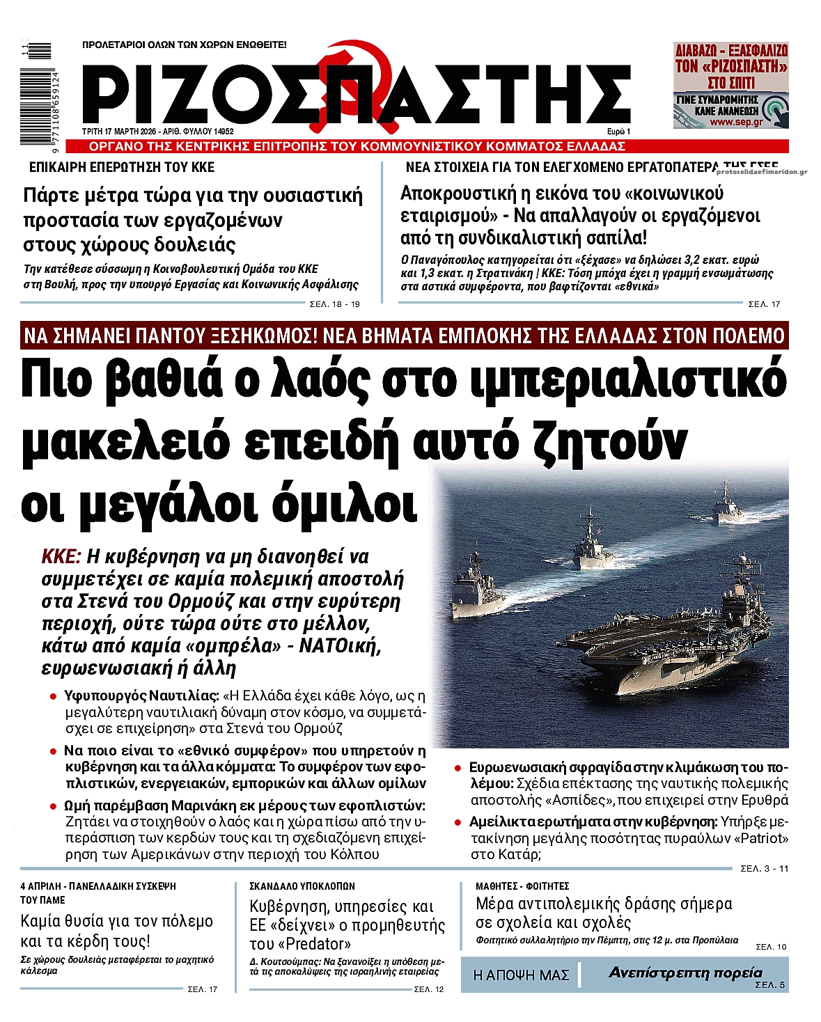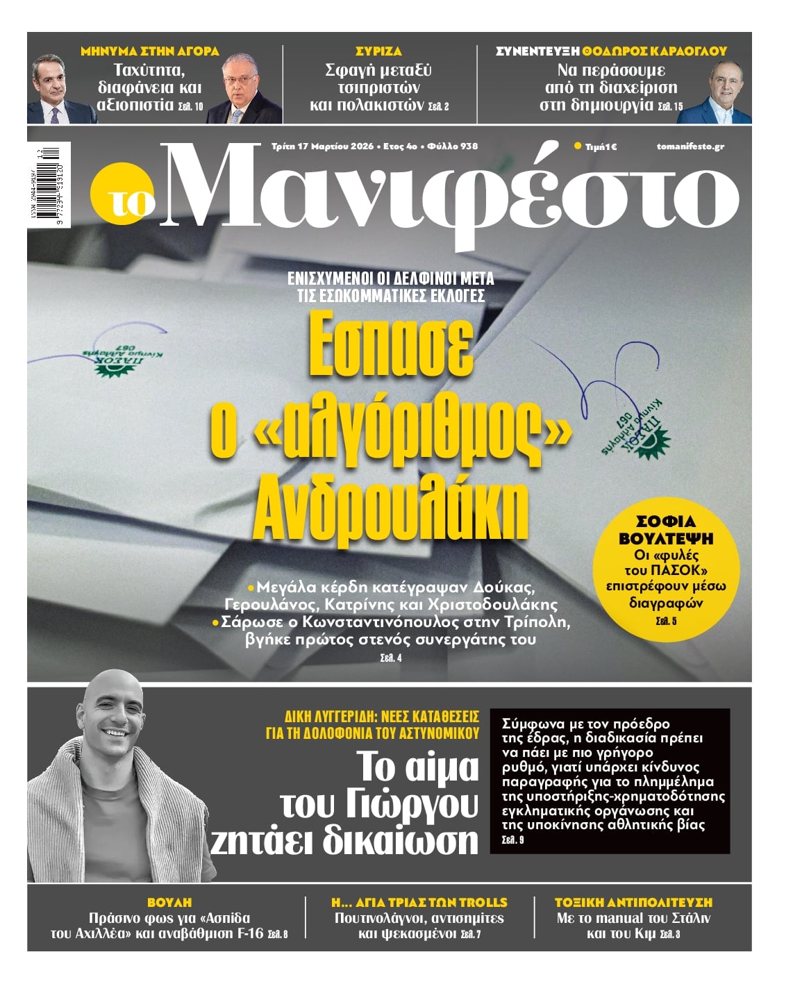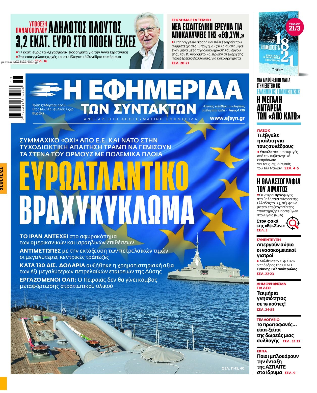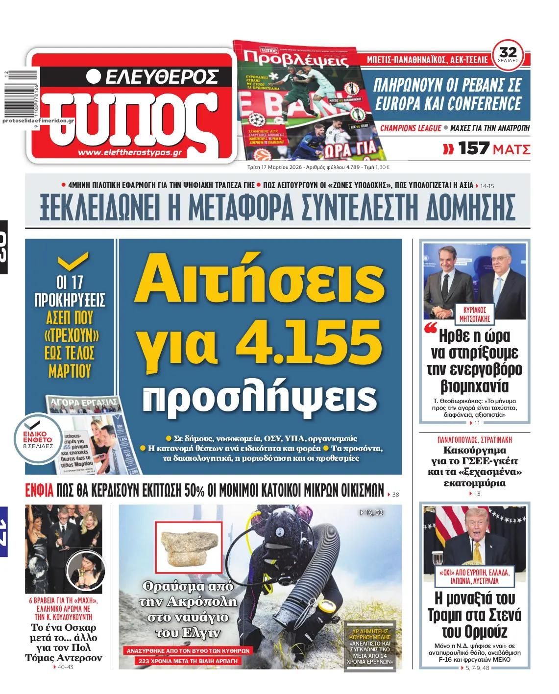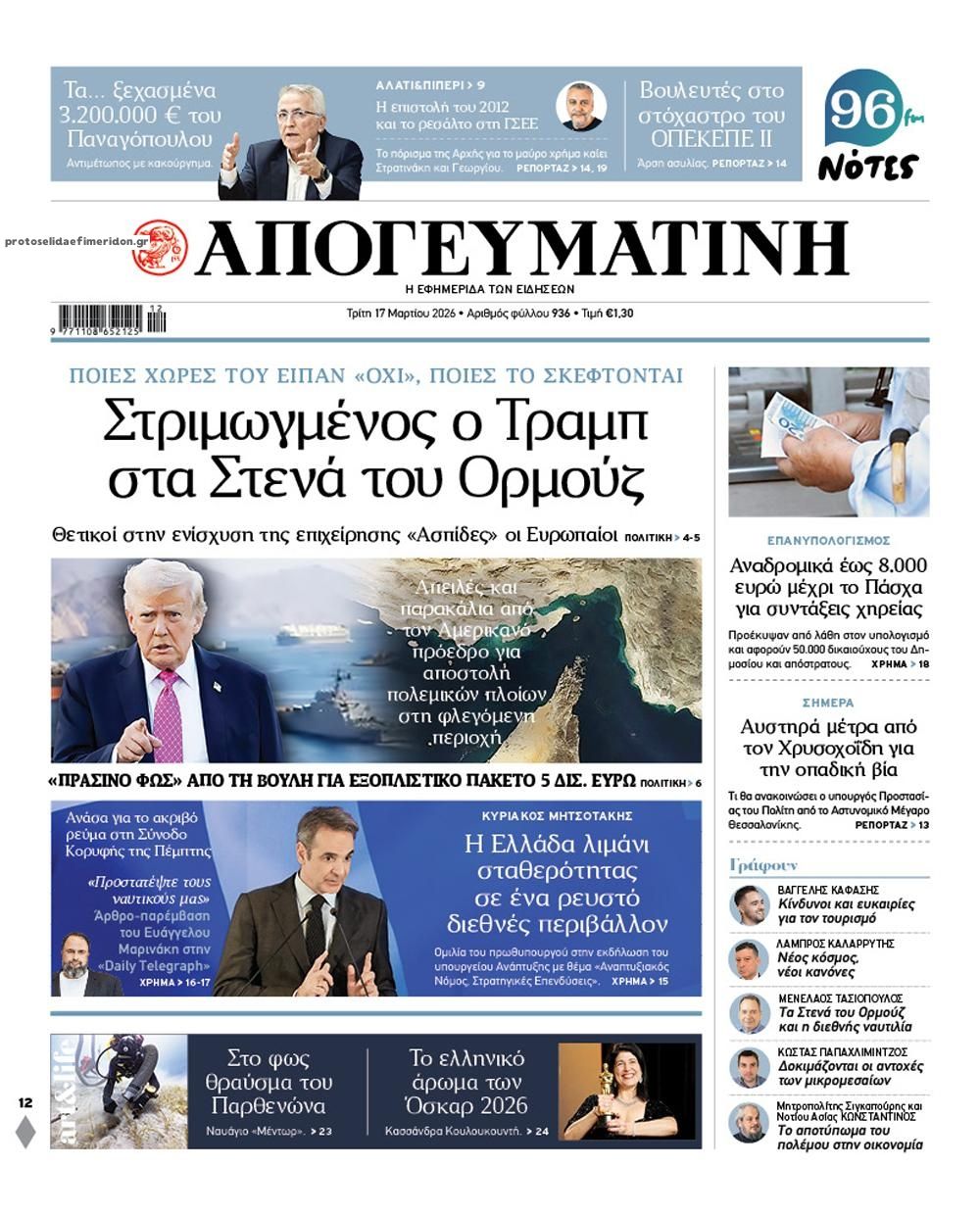 share Οι πολιτικές εφημερίδες 17/3/2026 δημοσιεύτηκε: 08:16 , 17 Μαρτίου 2026 Επικαιρότητα Διαβάστε τα πρωτοσέλιδα από τις πολιτικές εφημερίδες, σήμερα 17/3/2026. #ΕΦΗΜΕΡΙΔΕΣ #ΠΟΛΙΤΙΚΕΣ ΕΦΗΜΕΡΙΔΕΣ #ΠΡΩΤΟΣΕΛΙΔΑ share Σχόλια Αναγνωστών σχολίασε και εσύ Ακολουθήστε το στο Google News και μάθετε πρώτοι όλες τις ειδήσεις Δείτε όλες τις τελευταίες Ειδήσεις από την Ελλάδα και τον Κόσμο στο Ροή Οικονομία Επιχειρήσεις Επικαιρότητα 5 ώρες πριν Κρέατα: Σταθερές οι τιμές έως το τέλος της εβδομάδας- Ποια προβλήματα μπορεί να υπάρξουν με την... 5 ώρες πριν Καύσιμα: Πλησιάζουν τα 2 ευρώ σε Αθήνα και Θεσσαλονίκη – Διπλάσιες οι αυξήσεις για το... 14 ώρες πριν «Όχι» σε 13ο και 14ο μισθό στο Δημόσιο από την κυβέρνηση – «Εκτός του δημοσιονομικού χώρου των... 5 ώρες πριν Κρέατα: Σταθερές οι τιμές έως το τέλος της εβδομάδας- Ποια προβλήματα μπορεί να υπάρξουν με την... 5 ώρες πριν Καύσιμα: Πλησιάζουν τα 2 ευρώ σε Αθήνα και Θεσσαλονίκη – Διπλάσιες οι αυξήσεις για το... 14 ώρες πριν «Όχι» σε 13ο και 14ο μισθό στο Δημόσιο από την κυβέρνηση – «Εκτός του δημοσιονομικού χώρου των... 19 ώρες πριν Υπερταμείο: Αυτός είναι ο νέος διευθύνων σύμβουλος των ΕΛΤΑ 5 ημέρες πριν ΔΕΠΑ Εμπορίας: Νέο φορτίο LNG από τις ΗΠΑ στη Ρεβυθούσα 6 ημέρες πριν Νέα διεθνής επένδυση του Θοδωρή Κυριακού στην πλατφόρμα Uncensored του Piers Morgan 16 ώρες πριν Μητσοτάκης για ενεργοβόρο βιομηχανία: Μέσα στις επόμενες 15 μέρες οι ανακοινώσεις 23 ώρες πριν Ταξί: Σε πανελλαδική απεργία διαρκείας προχωρούν από αύριο – Λυμπερόπουλος: «Θέλουν να... 1 ημέρα πριν Αυτή την Κυριακή με τη Realnews: Instyle – Μαζί Drive ENIKOS NETWORK Ακούστε την εκπομπή του Νίκου Χατζηνικολάου 17/3/2026 Μπαμπά, σ ’αγαπώ: Ο Νίκος γίνεται το θύμα της Βιργινίας και της Στέλλας και ο Δημήτρης ο ήρωας του Βίκτωρα Καρκίνος του μαστού: Αύξηση παγκοσμίως και ανησυχητικές προβλέψεις έως το 2050 Δυσκολεύεστε να ανοίξετε ένα βάζο ή να σηκωθείτε από την καρέκλα; Πότε η μυϊκή αδυναμία δείχνει σοβαρό πρόβλημα Νέο ρεκόρ υπεραγωγιμότητας σε υψηλή θερμοκρασία και κανονική πίεση Γιατί η επαλήθευση της ασφάλειας αποκτά χαρακτήρα «agent» περισσότερα 09:10 , 12 Ιανουαρίου 2026 || Καιρός: Χιόνια και πολικές θερμοκρασίες σήμερα – Η πρόγνωση της ΕΜΥ Έντονο κύμα ψύχους θα επικρατήσει στη χώρα τη Δευτέρα με χαμηλές θερμοκρασίες. Χιονοπτώσεις αναμέ... 09:03 , 8 Δεκεμβρίου 2025 || Καιρός: Ισχυρές βροχές και καταιγίδες στην Κρήτη σήμερα – Αναλυτική πρόγνωση ανά περιοχή Ισχυρές βροχές και καταιγίδες προβλέπονται σήμερα, Δευτέρα 8 Δεκεμβρίου 2025 στη βόρεια Κρήτη σύμ... 15:10 , 23 Νοεμβρίου 2025 || Αυτή την Κυριακή με τη Realnews: Δωροεπιταγή 10€ Δωροεπιταγή αξίας 10€ για αγορές άνω των 60€ από τα πολυκαταστήματα Factory Outlet. H προσφορά ισ... 09:40 , 23 Νοεμβρίου 2025 || Αυτή την Κυριακή με τη Realnews: Instyle, μαζί Drive Αυτή την Κυριακή με τη Realnews: Instyle, μαζί Drive Instyle Η Κατερίνα Παπουτσάκη, η Helena Bac... 17:49 , 24 Σεπτεμβρίου 2025 || Ελληνικές Υπεραγορές Σκλαβενίτης: Τι απαντά για το πρόστιμο ύψους 1,44 εκατ. ευρώ Ανακοίνωση εξέδωσε η “Ελληνικές Υπεραγορές Σκλαβενίτης” σχετικά με το πρόστιμο ύψους ... 10:16 , 21 Σεπτεμβρίου 2025 || Σήμερα με τη Realnews: Instyle – Μαζί Drive Σήμερα με τη Realnews: Instyle, μαζί Drive Instyle Η Andie MacDowell, η Renate Reinsve και ο Οδυ... 12:05 , 7 Σεπτεμβρίου 2025 || Σήμερα με τη Realnews: Απόκρυφες τελετές της Debra Bokur – Μαζί Real taste & style Αυτή την Κυριακή με τη Realnews: Απόκρυφες τελετές της Debra Bokur, μαζί Real taste & style. ... 22:08 , 30 Αυγούστου 2025 || Ξεκινά η κατασκευή του νέου αυτοκινητοδρόμου Ιωάννινα- Κακαβιά Μέχρι το τέλος του έτους ξεκιν