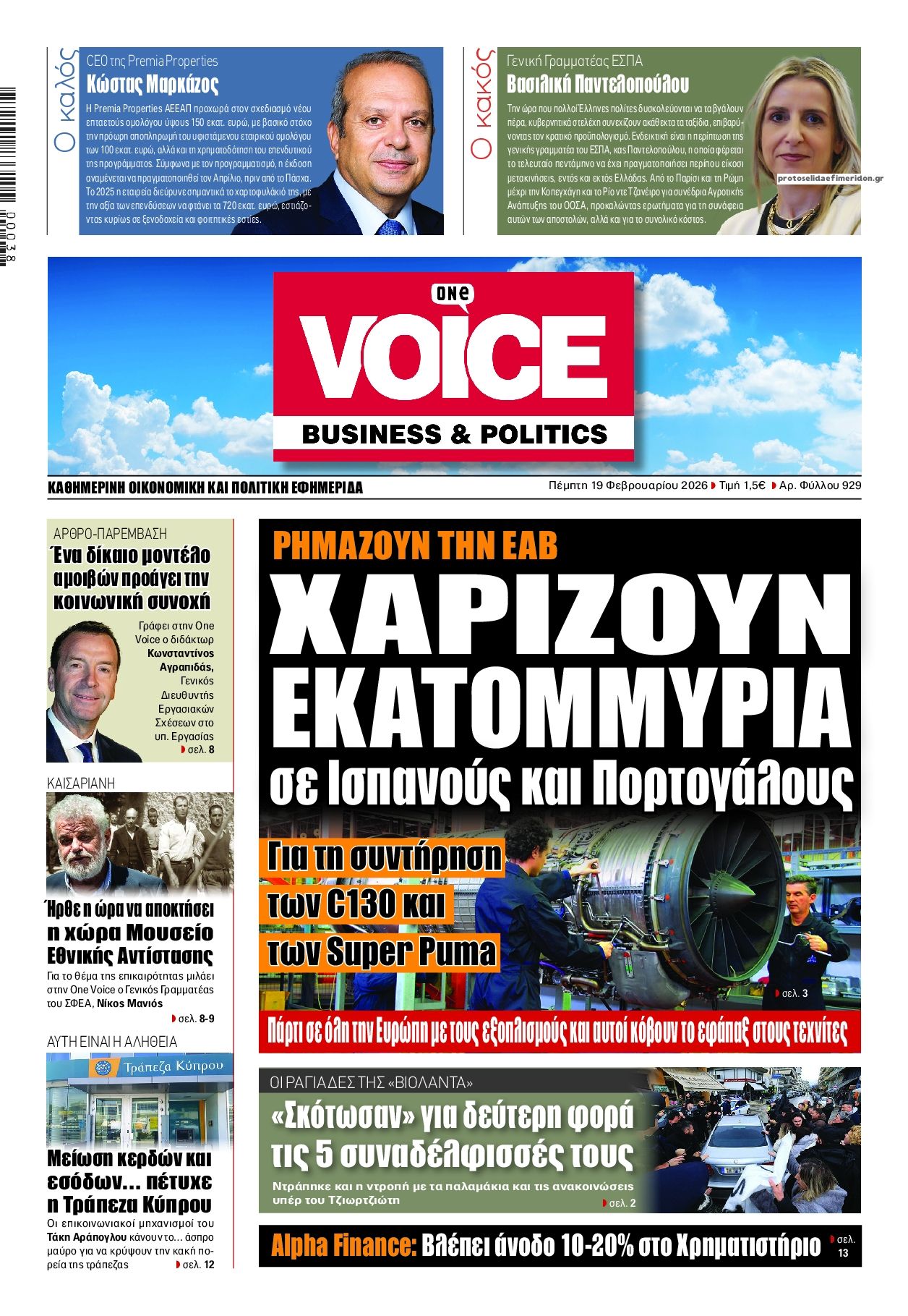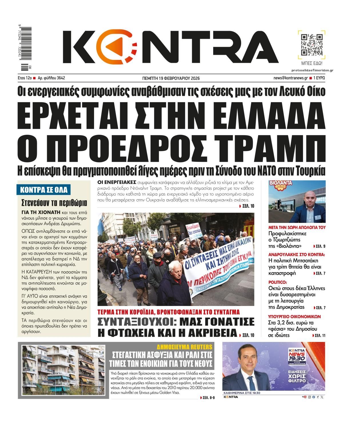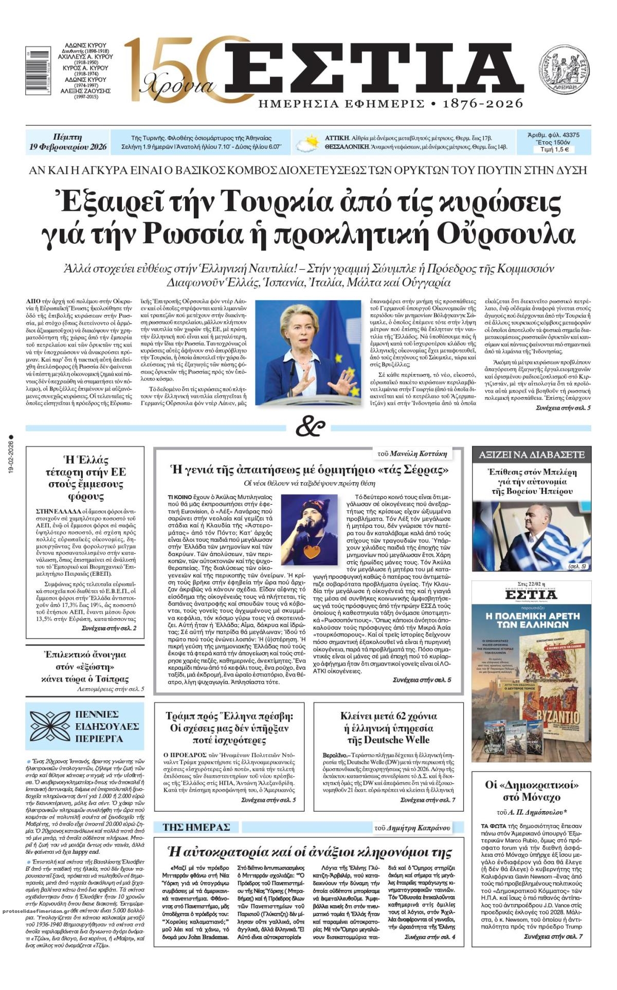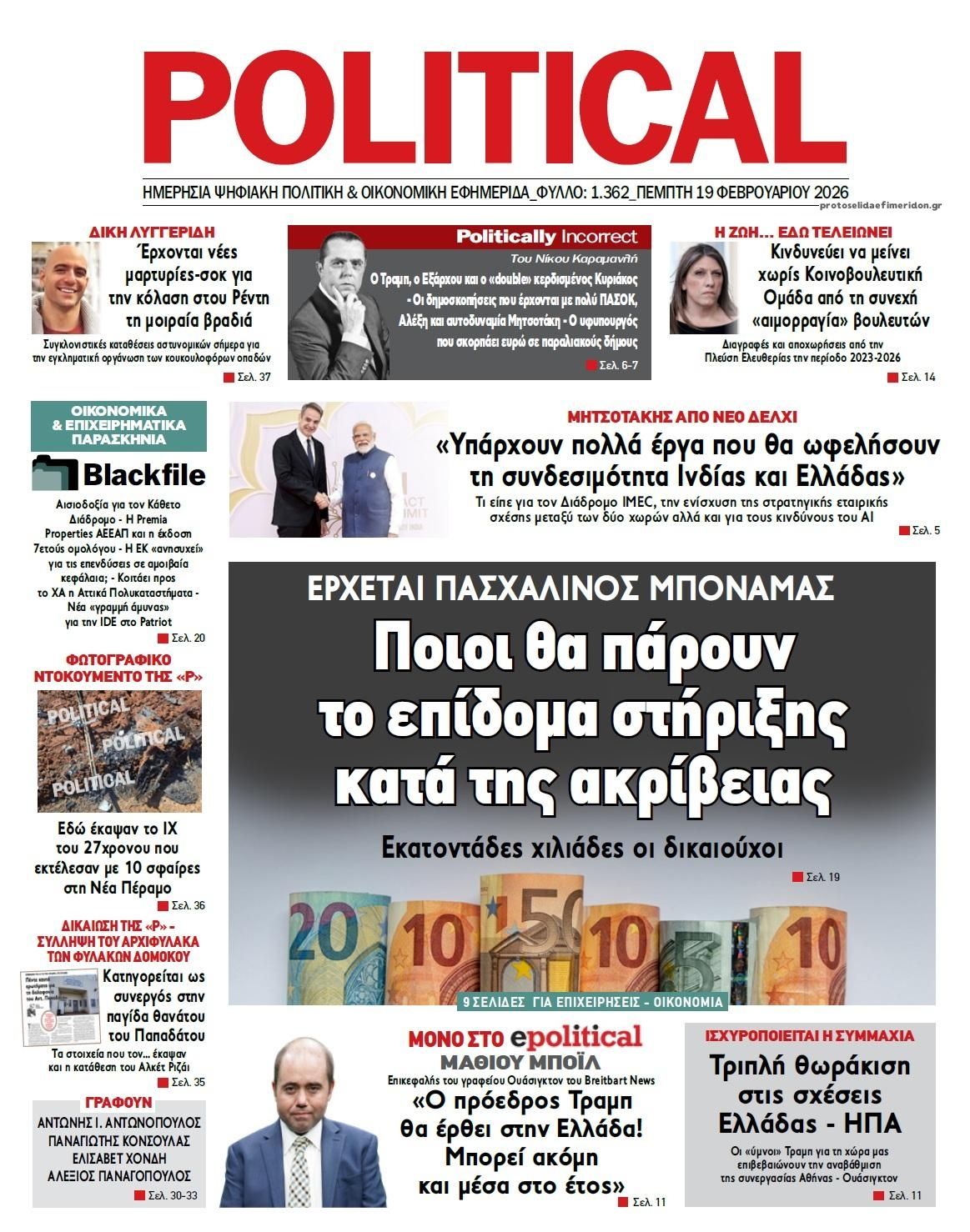 share Οι πολιτικές εφημερίδες 19/2/2026 δημοσιεύτηκε: 08:15 , 19 Φεβρουαρίου 2026 Επικαιρότητα Διαβάστε τα πρωτοσέλιδα από τις πολιτικές εφημερίδες, σήμερα 19/2/2026. #ΕΦΗΜΕΡΙΔΕΣ #ΠΟΛΙΤΙΚΕΣ ΕΦΗΜΕΡΙΔΕΣ #ΠΡΩΤΟΣΕΛΙΔΑ share Σχόλια Αναγνωστών σχολίασε και εσύ Ακολουθήστε το στο Google News και μάθετε πρώτοι όλες τις ειδήσεις Δείτε όλες τις τελευταίες Ειδήσεις από την Ελλάδα και τον Κόσμο στο Ροή Οικονομία Επιχειρήσεις Επικαιρότητα 31 λεπτά πριν ΑΑΔΕ: Τι αλλάζει στον φορολογικό έλεγχο των ηλεκτρονικών «πορτοφολιών» και ξένων τραπεζών 1 ώρα πριν e-ΕΦΚΑ και ΔΥΠΑ: Ολοκληρώνεται αύριο το μπαράζ πληρωμών – Ποιοι θα δουν χρήματα στους... 2 ώρες πριν Ελβετικό φράγκο: Άνοιξε η πλατφόρμα για τη ρύθμιση των δανείων – Ερωτήσεις και απαντήσεις 31 λεπτά πριν ΑΑΔΕ: Τι αλλάζει στον φορολογικό έλεγχο των ηλεκτρονικών «πορτοφολιών» και ξένων τραπεζών 4 ώρες πριν Επιδοτήσεις για την αύξηση της παραγωγής: Πότε θα ξεκινήσουν οι αιτήσεις από τις μικρομεσαίες... 16 ώρες πριν Δικαστική απόφαση – “σταθμός” βάζει… STOP στο τηλεφωνικό μάρκετινγκ – Τι αναφέρει η... 15 ώρες πριν Τράπεζα Κύπρου: Κέρδη μετά φόρων 481 εκατ. ευρώ για το 2025 4 ημέρες πριν Nέα εποχή για την ελληνική αμυντική βιομηχανία – Σε ποιους τομείς επικεντρώνεται το ενδιαφέρον... 7 ημέρες πριν Υπερταμείο: Στα 12 δισ. ευρώ το χαρτοφυλάκιο – Ποιες κινήσεις έγιναν το 2025 1 ημέρα πριν Συνεχίζεται η απεργία των ταξί στην Αττική: Άκαρπη η συνάντηση με τον Κυρανάκη – Χειρόφρενο... 2 ημέρες πριν Βελόπουλος: Ξαφνικά η κυβέρνηση θυμήθηκε τη μείωση του ΦΠΑ γιατί μυρίζουν εκλογές 2 ημέρες πριν Σταθερές ευρυζωνικές συνδέσεις: Άνοδο καταγράφει η Ελλάδα στην παγκόσμια κατάταξη ταχύτητας ENIKOS NETWORK Χανιά: Συναγερμός έπειτα από την εξαφάνιση 52χρονου – Έφυγε από το σπίτι του χωρίς κινητό «Βιολάντα:» «Είναι προφανές ότι λόγω της πίεσης της κοινής γνώμης, πάρθηκε η απόφαση προφυλάκισης» – Τι λέει ο δικηγόρος το... ECDC: Συναγερμός για τη μικροβιακή αντοχή στην Ελλάδα Χλωμό δέρμα και φτερούγισμα στην καρδιά: Πότε μπορεί να είναι συμπτώματα έλλειψης σιδήρου Νέα απειλή για τα Android κινητά – Χιλιάδες συσκευές έχουν ήδη μολυνθεί Λάθος του GPS οδήγησε βαν της Amazon σε πεδίο βολής του Στρατού περισσότερα 09:10 , 12 Ιανουαρίου 2026 || Καιρός: Χιόνια και πολικές θερμοκρασίες σήμερα – Η πρόγνωση της ΕΜΥ Έντονο κύμα ψύχους θα επικρατήσει στη χώρα τη Δευτέρα με χαμηλές θερμοκρασίες. Χιονοπτώσεις αναμέ... 09:03 , 8 Δεκεμβρίου 2025 || Καιρός: Ισχυρές βροχές και καταιγίδες στην Κρήτη σήμερα – Αναλυτική πρόγνωση ανά περιοχή Ισχυρές βροχές και καταιγίδες προβλέπονται σήμερα, Δευτέρα 8 Δεκεμβρίου 2025 στη βόρεια Κρήτη σύμ... 15:10 , 23 Νοεμβρίου 2025 || Αυτή την Κυριακή με τη Realnews: Δωροεπιταγή 10€ Δωροεπιταγή αξίας 10€ για αγορές άνω των 60€ από τα πολυκαταστήματα Factory Outlet. H προσφορά ισ... 09:40 , 23 Νοεμβρίου 2025 || Αυτή την Κυριακή με τη Realnews: Instyle, μαζί Drive Αυτή την Κυριακή με τη Realnews: Instyle, μαζί Drive Instyle Η Κατερίνα Παπουτσάκη, η Helena Bac... 17:49 , 24 Σεπτεμβρίου 2025 || Ελληνικές Υπεραγορές Σκλαβενίτης: Τι απαντά για το πρόστιμο ύψους 1,44 εκατ. ευρώ Ανακοίνωση εξέδωσε η “Ελληνικές Υπεραγορές Σκλαβενίτης” σχετικά με το πρόστιμο ύψους ... 10:16 , 21 Σεπτεμβρίου 2025 || Σήμερα με τη Realnews: Instyle – Μαζί Drive Σήμερα με τη Realnews: Instyle, μαζί Drive Instyle Η Andie MacDowell, η Renate Reinsve και ο Οδυ... 12:05 , 7 Σεπτεμβρίου 2025 || Σήμερα με τη Realnews: Απόκρυφες τελετές της Debra Bokur – Μαζί Real taste & style Αυτή την Κυριακή με τη Realnews: Απόκρυφες τελετές της Debra Bokur, μαζί Real taste & style. ... 22:08 , 30 Αυγ