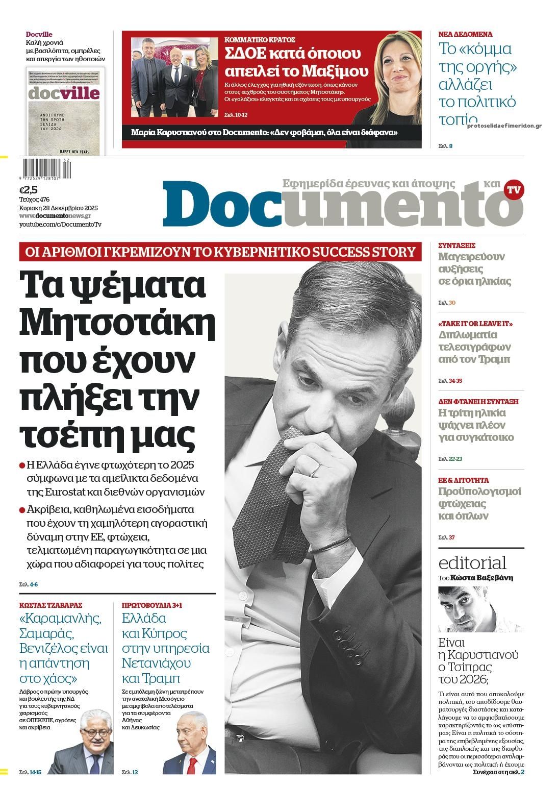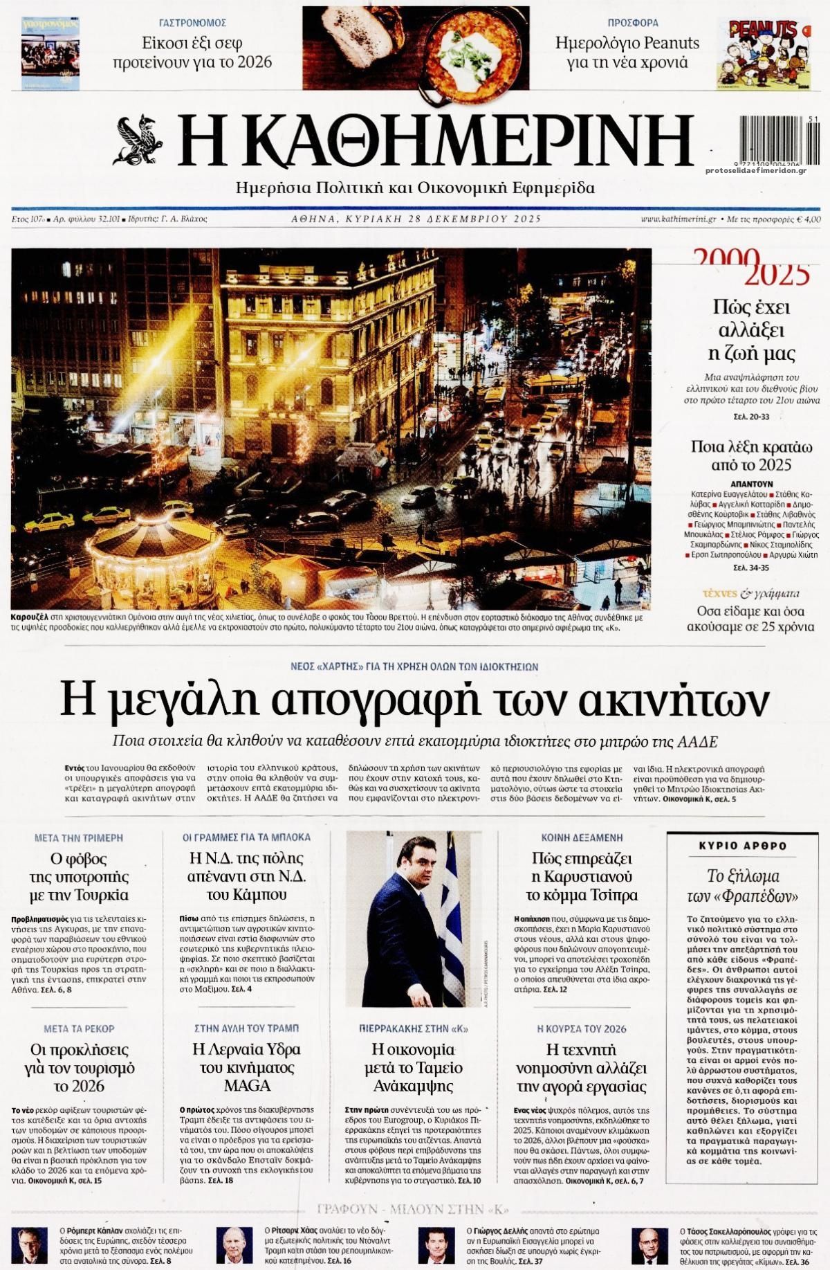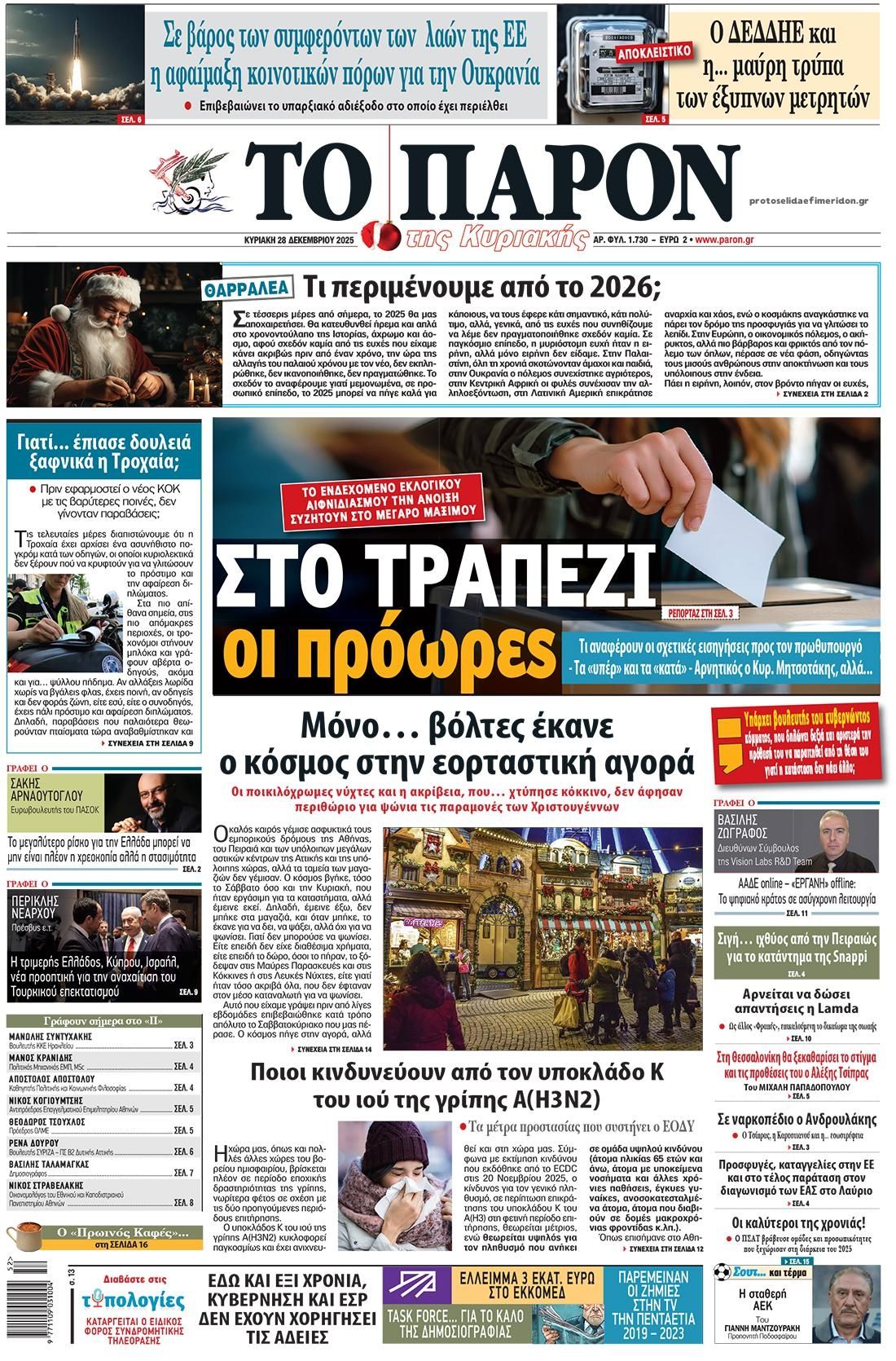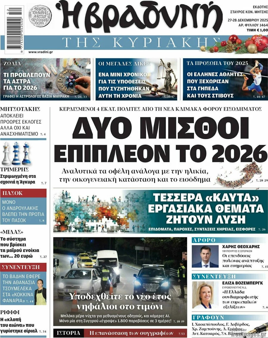 share Οι πολιτικές εφημερίδες 28/12/2025 δημοσιεύτηκε: 08:00 , 28 Δεκεμβρίου 2025 Επικαιρότητα Διαβάστε τα πρωτοσέλιδα από τις πολιτικές εφημερίδες, σήμερα 28/12/2025. #ΕΦΗΜΕΡΙΔΕΣ #ΠΟΛΙΤΙΚΕΣ ΕΦΗΜΕΡΙΔΕΣ #ΠΡΩΤΟΣΕΛΙΔΑ share Σχόλια Αναγνωστών σχολίασε και εσύ Ακολουθήστε το στο Google News και μάθετε πρώτοι όλες τις ειδήσεις Δείτε όλες τις τελευταίες Ειδήσεις από την Ελλάδα και τον Κόσμο στο Ροή Οικονομία Επιχειρήσεις Επικαιρότητα 26 λεπτά πριν Νέα προκήρυξη ΑΣΕΠ για προσλήψεις σε Δήμο: Έως αύριο οι αιτήσεις -Όλες οι λεπτομέρειες 1 ώρα πριν Καιρός: Νεφώσεις, τοπικές βροχές και θυελλώδεις άνεμοι σήμερα – Τα σενάρια για την Πρωτοχρονιά 3 ώρες πριν Βενζίνη: Πόσο θα πληρώσουν οι εκδρομείς της Πρωτοχρονιάς – Πώς θα διαμορφωθούν οι τιμές των... 26 λεπτά πριν Νέα προκήρυξη ΑΣΕΠ για προσλήψεις σε Δήμο: Έως αύριο οι αιτήσεις -Όλες οι λεπτομέρειες 12 ώρες πριν Γιατί οι συντάξεις Δημοσίου είναι διπλάσιες του ιδιωτικού τομέα – Έως και 715 ευρώ η διαφορά στα... 12 ώρες πριν Ακίνητα: Έρχεται “λίφτινγκ” από το 2026 στη φορολόγηση εισοδημάτων από ενοίκια – Ποιοι θα... 6 ημέρες πριν Υπερταμείο: Αυτός είναι ο νέος Διευθύνων Σύμβουλος των Συγκοινωνιών Αθηνών – Ομίλου ΟΑΣΑ 1 εβδομάδα πριν Όμιλος ΔΕΗ: Νέα ορόσημα και ενισχυμένη διαφάνεια στην ετήσια Έκθεση Βιώσιμης Ανάπτυξης 1 εβδομάδα πριν ΕΛΤΑ: Αυτό είναι το νέο σχέδιο μετασχηματισμού του Οργανισμού- Τι δήλωσαν Πιερρακάκης και... 1 ώρα πριν Καιρός: Νεφώσεις, τοπικές βροχές και θυελλώδεις άνεμοι σήμερα – Τα σενάρια για την Πρωτοχρονιά 20 ώρες πριν Η Realnews που κυκλοφορεί σήμερα 21 ώρες πριν «Κατεβάζουν ρολά» σήμερα πολλά θέατρα – Τι ζητούν ηθοποιοί και μουσικοί ENIKOS NETWORK Μιανμάρ: Σήμερα οι πρώτες βουλευτικές εκλογές μετά το στρατιωτικό πραξικόπημα Γιάννα Σταυράκη για την περιπέτεια της υγείας της: «Είχα την προστασία της Παναγίας…» Αναστατώνεστε αυτήν την ώρα της ημέρας; Πότε μπορεί να είναι σύμπτωμα άνοιας Η Selena Gomez μιλά ανοιχτά για το «μουστάκι» της – Ποια είναι η δερματική πάθηση που το προκαλεί LinkedIn: Προειδοποίηση για 1,2 δισεκατομμύρια χρήστες – Τα «red flags» στις εργασιακές απάτες Ειδικός στα UFO αποκαλύπτει επαφές με εξωγήινους σε μυστικό πρόγραμμα των ΗΠΑ περισσότερα 09:03 , 8 Δεκεμβρίου 2025 || Καιρός: Ισχυρές βροχές και καταιγίδες στην Κρήτη σήμερα – Αναλυτική πρόγνωση ανά περιοχή Ισχυρές βροχές και καταιγίδες προβλέπονται σήμερα, Δευτέρα 8 Δεκεμβρίου 2025 στη βόρεια Κρήτη σύμ... 15:10 , 23 Νοεμβρίου 2025 || Αυτή την Κυριακή με τη Realnews: Δωροεπιταγή 10€ Δωροεπιταγή αξίας 10€ για αγορές άνω των 60€ από τα πολυκαταστήματα Factory Outlet. H προσφορά ισ... 09:40 , 23 Νοεμβρίου 2025 || Αυτή την Κυριακή με τη Realnews: Instyle, μαζί Drive Αυτή την Κυριακή με τη Realnews: Instyle, μαζί Drive Instyle Η Κατερίνα Παπουτσάκη, η Helena Bac... 17:49 , 24 Σεπτεμβρίου 2025 || Ελληνικές Υπεραγορές Σκλαβενίτης: Τι απαντά για το πρόστιμο ύψους 1,44 εκατ. ευρώ Ανακοίνωση εξέδωσε η “Ελληνικές Υπεραγορές Σκλαβενίτης” σχετικά με το πρόστιμο ύψους ... 10:16 , 21 Σεπτεμβρίου 2025 || Σήμερα με τη Realnews: Instyle – Μαζί Drive Σήμερα με τη Realnews: Instyle, μαζί Drive Instyle Η Andie MacDowell, η Renate Reinsve και ο Οδυ... 12:05 , 7 Σεπτεμβρίου 2025 || Σήμερα με τη Realnews: Απόκρυφες τελετές της Debra Bokur – Μαζί Real taste & style Αυτή την Κυριακή με τη Realnews: Απόκρυφες τελετές της Debra Bokur, μαζί Real taste & style. ... 22:08 , 30 Αυγούστου 2025 || Ξεκινά η κατασκευή του νέου αυτοκινητοδρόμου Ιωάννινα- Κακαβιά Μέχρι το τέλος του έτους ξεκινά η κατασκευή του νέου αυτοκινητοδρόμου Ιωάννινα-Κακαβιά που αποτελ... 07:30 , 24 Αυγούστου 2025 || 
