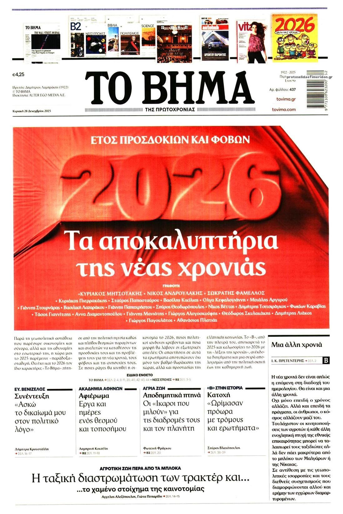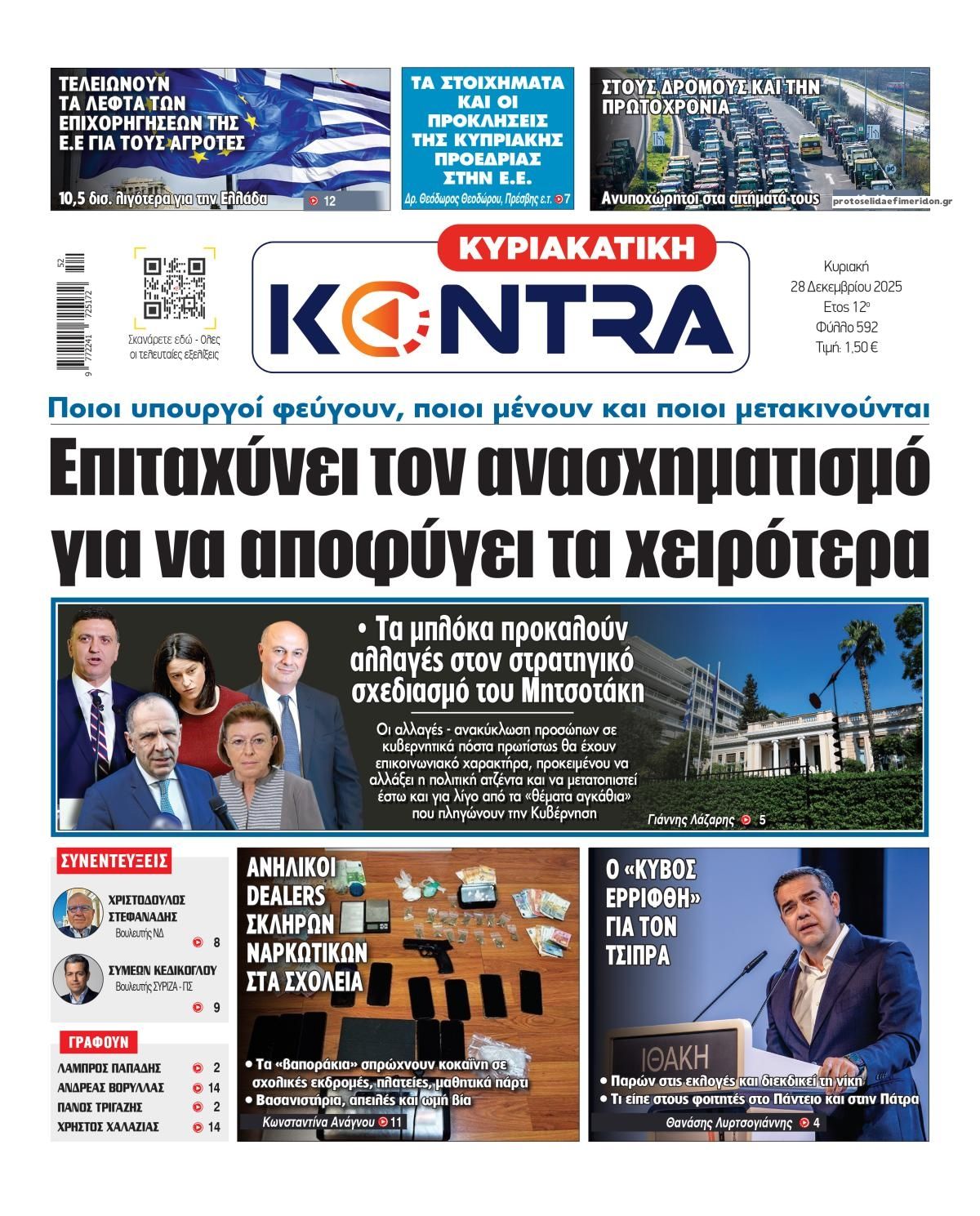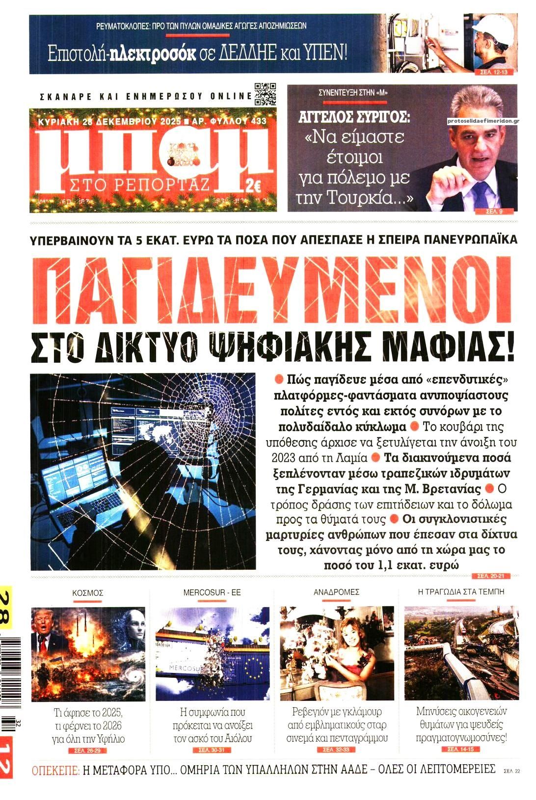 share Οι πολιτικές εφημερίδες 28/12/2025 δημοσιεύτηκε: 08:00 , 28 Δεκεμβρίου 2025 Επικαιρότητα Διαβάστε τα πρωτοσέλιδα από τις πολιτικές εφημερίδες, σήμερα 28/12/2025. #ΕΦΗΜΕΡΙΔΕΣ #ΠΟΛΙΤΙΚΕΣ ΕΦΗΜΕΡΙΔΕΣ #ΠΡΩΤΟΣΕΛΙΔΑ share Σχόλια Αναγνωστών σχολίασε και εσύ Ακολουθήστε το στο Google News και μάθετε πρώτοι όλες τις ειδήσεις Δείτε όλες τις τελευταίες Ειδήσεις από την Ελλάδα και τον Κόσμο στο Ροή Οικονομία Επιχειρήσεις Επικαιρότητα 26 λεπτά πριν Νέα προκήρυξη ΑΣΕΠ για προσλήψεις σε Δήμο: Έως αύριο οι αιτήσεις -Όλες οι λεπτομέρειες 1 ώρα πριν Καιρός: Νεφώσεις, τοπικές βροχές και θυελλώδεις άνεμοι σήμερα – Τα σενάρια για την Πρωτοχρονιά 3 ώρες πριν Βενζίνη: Πόσο θα πληρώσουν οι εκδρομείς της Πρωτοχρονιάς – Πώς θα διαμορφωθούν οι τιμές των... 26 λεπτά πριν Νέα προκήρυξη ΑΣΕΠ για προσλήψεις σε Δήμο: Έως αύριο οι αιτήσεις -Όλες οι λεπτομέρειες 12 ώρες πριν Γιατί οι συντάξεις Δημοσίου είναι διπλάσιες του ιδιωτικού τομέα – Έως και 715 ευρώ η διαφορά στα... 12 ώρες πριν Ακίνητα: Έρχεται “λίφτινγκ” από το 2026 στη φορολόγηση εισοδημάτων από ενοίκια – Ποιοι θα... 6 ημέρες πριν Υπερταμείο: Αυτός είναι ο νέος Διευθύνων Σύμβουλος των Συγκοινωνιών Αθηνών – Ομίλου ΟΑΣΑ 1 εβδομάδα πριν Όμιλος ΔΕΗ: Νέα ορόσημα και ενισχυμένη διαφάνεια στην ετήσια Έκθεση Βιώσιμης Ανάπτυξης 1 εβδομάδα πριν ΕΛΤΑ: Αυτό είναι το νέο σχέδιο μετασχηματισμού του Οργανισμού- Τι δήλωσαν Πιερρακάκης και... 1 ώρα πριν Καιρός: Νεφώσεις, τοπικές βροχές και θυελλώδεις άνεμοι σήμερα – Τα σενάρια για την Πρωτοχρονιά 20 ώρες πριν Η Realnews που κυκλοφορεί σήμερα 21 ώρες πριν «Κατεβάζουν ρολά» σήμερα πολλά θέατρα – Τι ζητούν ηθοποιοί και μουσικοί ENIKOS NETWORK Μιανμάρ: Σήμερα οι πρώτες βουλευτικές εκλογές μετά το στρατιωτικό πραξικόπημα Γιάννα Σταυράκη για την περιπέτεια της υγείας της: «Είχα την προστασία της Παναγίας…» Αναστατώνεστε αυτήν την ώρα της ημέρας; Πότε μπορεί να είναι σύμπτωμα άνοιας Η Selena Gomez μιλά ανοιχτά για το «μουστάκι» της – Ποια είναι η δερματική πάθηση που το προκαλεί LinkedIn: Προειδοποίηση για 1,2 δισεκατομμύρια χρήστες – Τα «red flags» στις εργασιακές απάτες Ειδικός στα UFO αποκαλύπτει επαφές με εξωγήινους σε μυστικό πρόγραμμα των ΗΠΑ περισσότερα 09:03 , 8 Δεκεμβρίου 2025 || Καιρός: Ισχυρές βροχές και καταιγίδες στην Κρήτη σήμερα – Αναλυτική πρόγνωση ανά περιοχή Ισχυρές βροχές και καταιγίδες προβλέπονται σήμερα, Δευτέρα 8 Δεκεμβρίου 2025 στη βόρεια Κρήτη σύμ... 15:10 , 23 Νοεμβρίου 2025 || Αυτή την Κυριακή με τη Realnews: Δωροεπιταγή 10€ Δωροεπιταγή αξίας 10€ για αγορές άνω των 60€ από τα πολυκαταστήματα Factory Outlet. H προσφορά ισ... 09:40 , 23 Νοεμβρίου 2025 || Αυτή την Κυριακή με τη Realnews: Instyle, μαζί Drive Αυτή την Κυριακή με τη Realnews: Instyle, μαζί Drive Instyle Η Κατερίνα Παπουτσάκη, η Helena Bac... 17:49 , 24 Σεπτεμβρίου 2025 || Ελληνικές Υπεραγορές Σκλαβενίτης: Τι απαντά για το πρόστιμο ύψους 1,44 εκατ. ευρώ Ανακοίνωση εξέδωσε η “Ελληνικές Υπεραγορές Σκλαβενίτης” σχετικά με το πρόστιμο ύψους ... 10:16 , 21 Σεπτεμβρίου 2025 || Σήμερα με τη Realnews: Instyle – Μαζί Drive Σήμερα με τη Realnews: Instyle, μαζί Drive Instyle Η Andie MacDowell, η Renate Reinsve και ο Οδυ... 12:05 , 7 Σεπτεμβρίου 2025 || Σήμερα με τη Realnews: Απόκρυφες τελετές της Debra Bokur – Μαζί Real taste & style Αυτή την Κυριακή με τη Realnews: Απόκρυφες τελετές της Debra Bokur, μαζί Real taste & style. ... 22:08 , 30 Αυγούστου 2025 || Ξεκινά η κατασκευή του νέου αυτοκινητοδρόμου Ιωάννινα- Κακαβιά Μέχρι το τέλος του έτους ξεκινά η κατασκευή του νέου αυτοκινητοδρόμου Ιωάννινα-Κακαβιά που αποτελ... 07:30 , 24 Αυγούστου 2025 || 