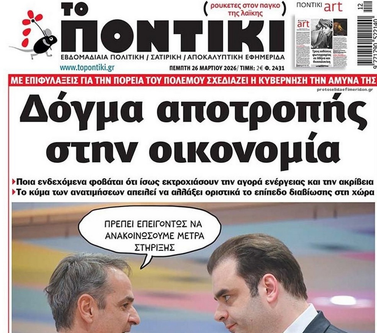 share Το Ποντίκι σήμερα Πέμπτη 26/3/2026 δημοσιεύτηκε: 09:05 , 26 Μαρτίου 2026 Επικαιρότητα Διαβάστε το πρωτοσέλιδο της εφημερίδας «Το Ποντίκι» σήμερα 26/3/2026. #ΕΦΗΜΕΡΙΔΕΣ #ΠΡΩΤΟΣΕΛΙΔΑ #ΤΟ ΠΟΝΤΙΚΙ share Σχόλια Αναγνωστών σχολίασε και εσύ Ακολουθήστε το στο Google News και μάθετε πρώτοι όλες τις ειδήσεις Δείτε όλες τις τελευταίες Ειδήσεις από την Ελλάδα και τον Κόσμο στο Ροή Οικονομία Επιχειρήσεις Επικαιρότητα 24 λεπτά πριν Αυτοκίνητα: Τι δείχνουν τα νέα στοιχεία για τις πωλήσεις των καινούργιων αυτοκινήτων 54 λεπτά πριν ΕΝΦΙΑ: Τι δείχνουν τα στοιχεία για την ακίνητη περιουσία των Ελλήνων – Οι πλουσιότερες και οι... 3 ώρες πριν «Ειδικό» επίδομα από τη ΔΥΠΑ σε ανέργους: Πότε θα καταβληθεί, ποιοι είναι οι δικαιούχοι –... 24 λεπτά πριν Αυτοκίνητα: Τι δείχνουν τα νέα στοιχεία για τις πωλήσεις των καινούργιων αυτοκινήτων 54 λεπτά πριν ΕΝΦΙΑ: Τι δείχνουν τα στοιχεία για την ακίνητη περιουσία των Ελλήνων – Οι πλουσιότερες και οι... 4 ώρες πριν Fuel Pass: Ερωτήσεις και απαντήσεις για τις επιδοτήσεις στα καύσιμα – Όλα όσα πρέπει να γνωρίζουν... 22 ώρες πριν Motor Oil: Διαφοροποίηση των πηγών προμήθειας αργού λόγω της κρίσης 3 ημέρες πριν Κίνηση-ματ από τον Θοδωρή Κυριακού – Ο όμιλος Antenna εξαγόρασε τον κορυφαίο οργανισμό Μέσων... 6 ημέρες πριν Στάσσης: Η ΔΕΗ είναι προστατευμένη από τις επιπτώσεις του πολέμου στη Μέση Ανατολή 16 ώρες πριν Νέο κληρονομικό δίκαιο: Τι αλλάζει στις διαθήκες 19 ώρες πριν 1821: Η οικονομική κατάσταση των εξεγερμένων Ελλήνων στα χρόνια της επανάστασης 1 ημέρα πριν Οι αθλητικές εφημερίδες 25/3/2026 ENIKOS NETWORK Ιράν: Οι Χούθι έτοιμοι να συμμετάσχουν στον πόλεμο – Στο στόχαστρο στρατηγικό πέρασμα της Ερυθράς Θάλασσας Ακούστε το σχόλιο του Νίκου Χατζηνικολάου 26/3/2026 Λαχανιάζετε όταν ανεβαίνετε σκάλες; Πότε μπορεί να δείχνει ότι η καρδιά σας κινδυνεύει Βήχας τη νύχτα: Τι μπορεί να τον προκαλεί – Με ποιες παθήσεις συνδέεται Τεστ παρατηρητικότητας: Μπορείτε να βρείτε τις 3 διαφορές στις εικόνες με έναν barista σε 11 δευτερόλεπτα Η Alexa αναβαθμίζεται με Τεχνητή Νοημοσύνη: Όλα όσα φέρνει η νέα Alexa+ περισσότερα 20:20 , 25 Μαρτίου 2026 || ΑΑΔΕ: Εξαρθρώθηκε διεθνές δίκτυο λαθρεμπορίου τσιγάρων – Το modus operandi και οι «tobacco mules» Ένα οργανωμένο και πολυεπίπεδο διεθνές δίκτυο που δραστηριοποιούνταν στο λαθρεμπόριο τσιγάρων, εξ... 09:30 , 22 Μαρτίου 2026 || Με τη Realnews που κυκλοφορεί: Instyle – Μαζί Drive Αυτή την Κυριακή με τη Realnews: Instyle – Μαζί Drive InStyle Η Βάσω Λασκαράκη, ο Jude Law, ο Γι... 09:10 , 12 Ιανουαρίου 2026 || Καιρός: Χιόνια και πολικές θερμοκρασίες σήμερα – Η πρόγνωση της ΕΜΥ Έντονο κύμα ψύχους θα επικρατήσει στη χώρα τη Δευτέρα με χαμηλές θερμοκρασίες. Χιονοπτώσεις αναμέ... 09:03 , 8 Δεκεμβρίου 2025 || Καιρός: Ισχυρές βροχές και καταιγίδες στην Κρήτη σήμερα – Αναλυτική πρόγνωση ανά περιοχή Ισχυρές βροχές και καταιγίδες προβλέπονται σήμερα, Δευτέρα 8 Δεκεμβρίου 2025 στη βόρεια Κρήτη σύμ... 15:10 , 23 Νοεμβρίου 2025 || Αυτή την Κυριακή με τη Realnews: Δωροεπιταγή 10€ Δωροεπιταγή αξίας 10€ για αγορές άνω των 60€ από τα πολυκαταστήματα Factory Outlet. H προσφορά ισ... 09:40 , 23 Νοεμβρίου 2025 || Αυτή την Κυριακή με τη Realnews: Instyle, μαζί Drive Αυτή την Κυριακή με τη Realnews: Instyle, μαζί Drive Instyle Η Κατερίνα Παπουτσάκη, η Helena Bac... 17:49 , 24 Σεπτεμβρίου 2025 || Ελληνικές Υπεραγορές Σκλαβενίτης: Τι απαντά για το πρόστιμο ύψους 1,44 εκατ. ευρώ Ανακοίνωση εξέδωσε η “Ελληνικές Υπεραγορές Σκλαβενίτης” σχετικά με το πρόστιμο ύψους ... 10:16 , 21 Σεπτεμβρίου 2025 || Σήμερα με τη Realnews: Instyle – Μαζί Drive Σήμερα 
