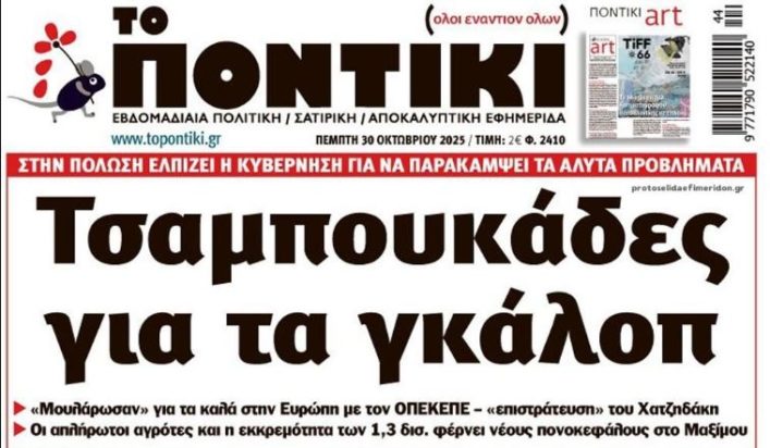Το Ποντίκι σήμερα Πέμπτη 30/10/2025 7 ώρες ago Επικαιρότητα ΤΟ ΠΟΝΤΙΚΙ Διαβάστε το πρωτοσέλιδο της εφημερίδας «Το Ποντίκι» σήμερα 30/10/2025.